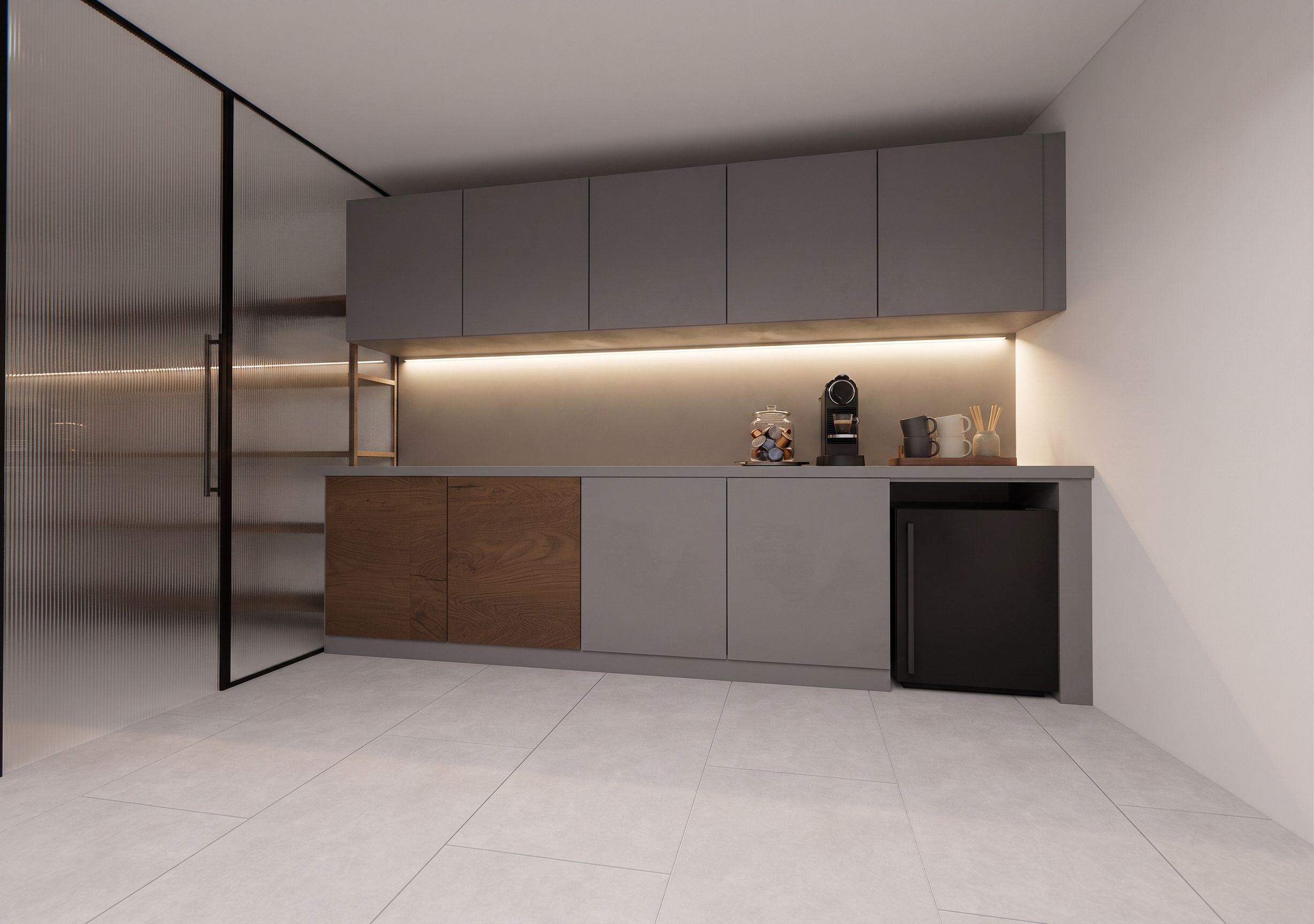 PromptAñade al tope cafetera y cosas de cocina de oficina ya que es una mini kitchenette no modifiques ni cambies más nada , keep exact camera angle