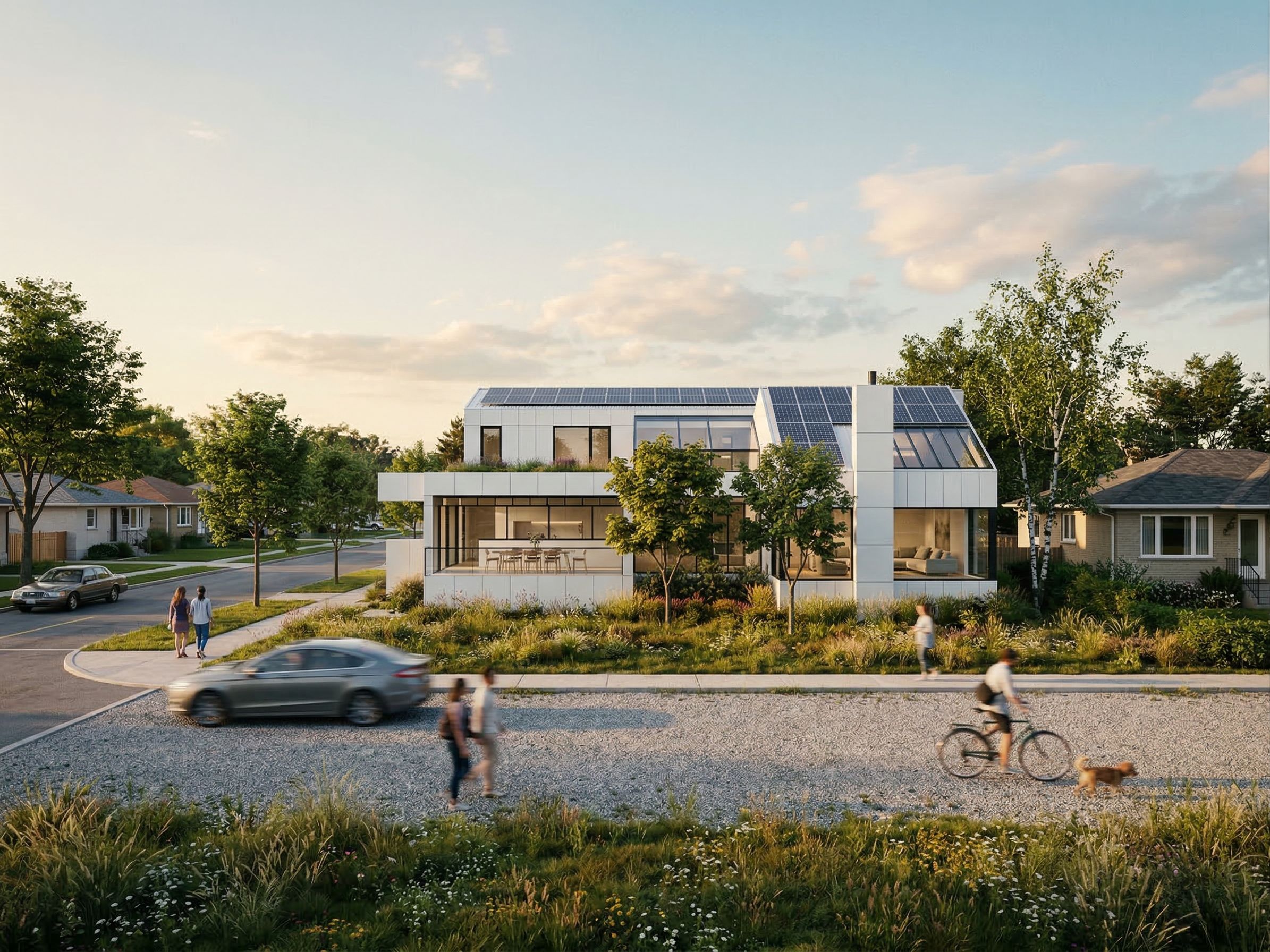 Promptvery modern, white metal panels, black frame glazing, solar panels situate in suburban neighbourhood - no base plinth and add bungalow housing at each side with front lane only sidewalk and trees in frground - gravel lane with low wild grasses in foreground. use previous image with front street on left side perpendicular to lane, keep exact camera angle