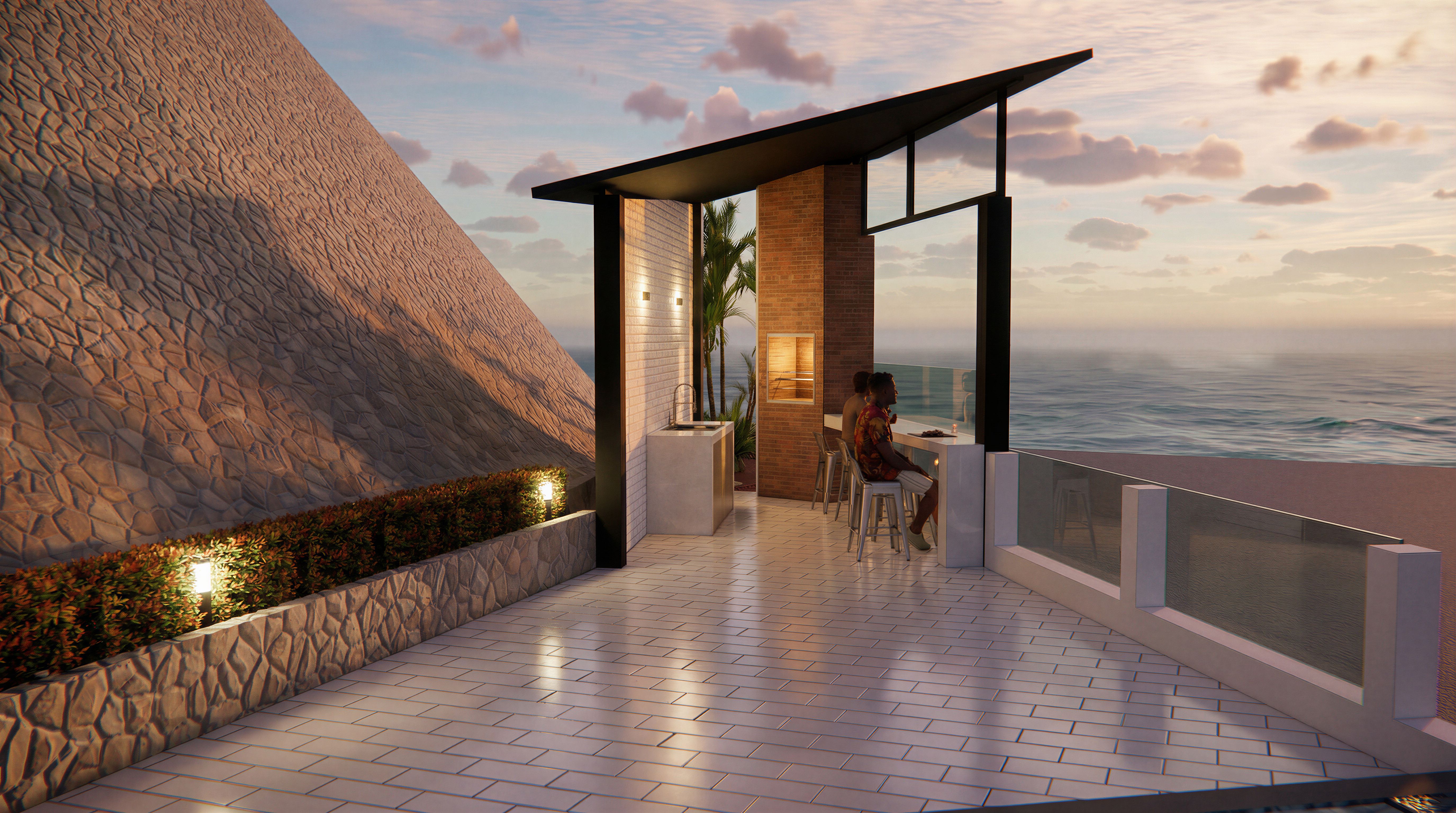 EnhancedPromptTransform this basic architectural render into a professional architectural photograph. Preserve the EXACT architecture, geometry and camera angle. Do not modify the design or layout. Enhance realism with physically accurate materials: natural concrete pores, matte stucco with subtle imperfections, realistic glass reflections and transparency, detailed stone and brushed metal surfaces. Improve lighting using professional architectural photography: natural sunlight, balanced exposure, global illumination, soft shadows, subtle ambient occlusion for depth. Enhance colors while keeping them natural and elegant. Increase contrast, depth and clarity. Add lush realistic vegetation with natural color variation, detailed leaves and dense grass. Replace the sky with a realistic sky with soft clouds and natural daylight atmosphere. Transform the blue background visible in the distance into a realistic ocean landscape: natural sea color variations, subtle waves, realistic water reflections, atmospheric perspective and a natural horizon line blending with the sky. Ultra-photorealistic architectural photography, HDR dynamic range, ray-traced reflections, ultra sharp focus, realistic depth, architectural magazine quality, shot on a full-frame camera with a 35mm architectural lens.