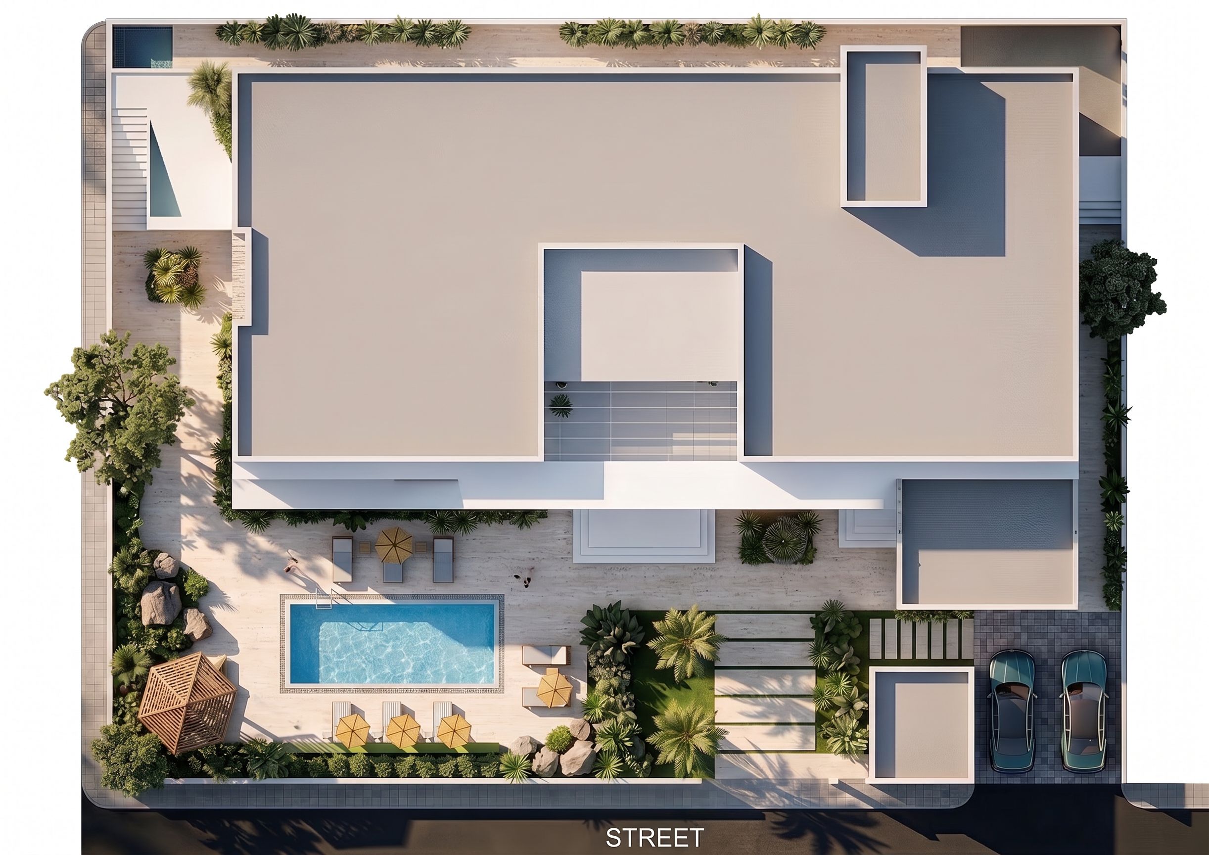 المخطط المرفق هو الموقع العام لفيلا سكنية وفي المقدمة مسبح وعلى مع اسرة بحر بعدد 3 مع مظلات من البامبو بجوار الاسرة مع درج ينزل الى القبو في الزاوية اليسرى واحتاج اخراج التصميم معماريا بواقعية كبيرة مع الظلال مع الالتزام الصارم بشكل الممرات والمناطق الخضراء ولكن يجب الالتزام بالتصميم دون تعديل في المقاسات او الاشكال او مكان المسبح ومادة اكساء الممرات هي رخام الترافرتين ولا احتاج ان تكون الاسقف قرميدية, keep exact camera angle