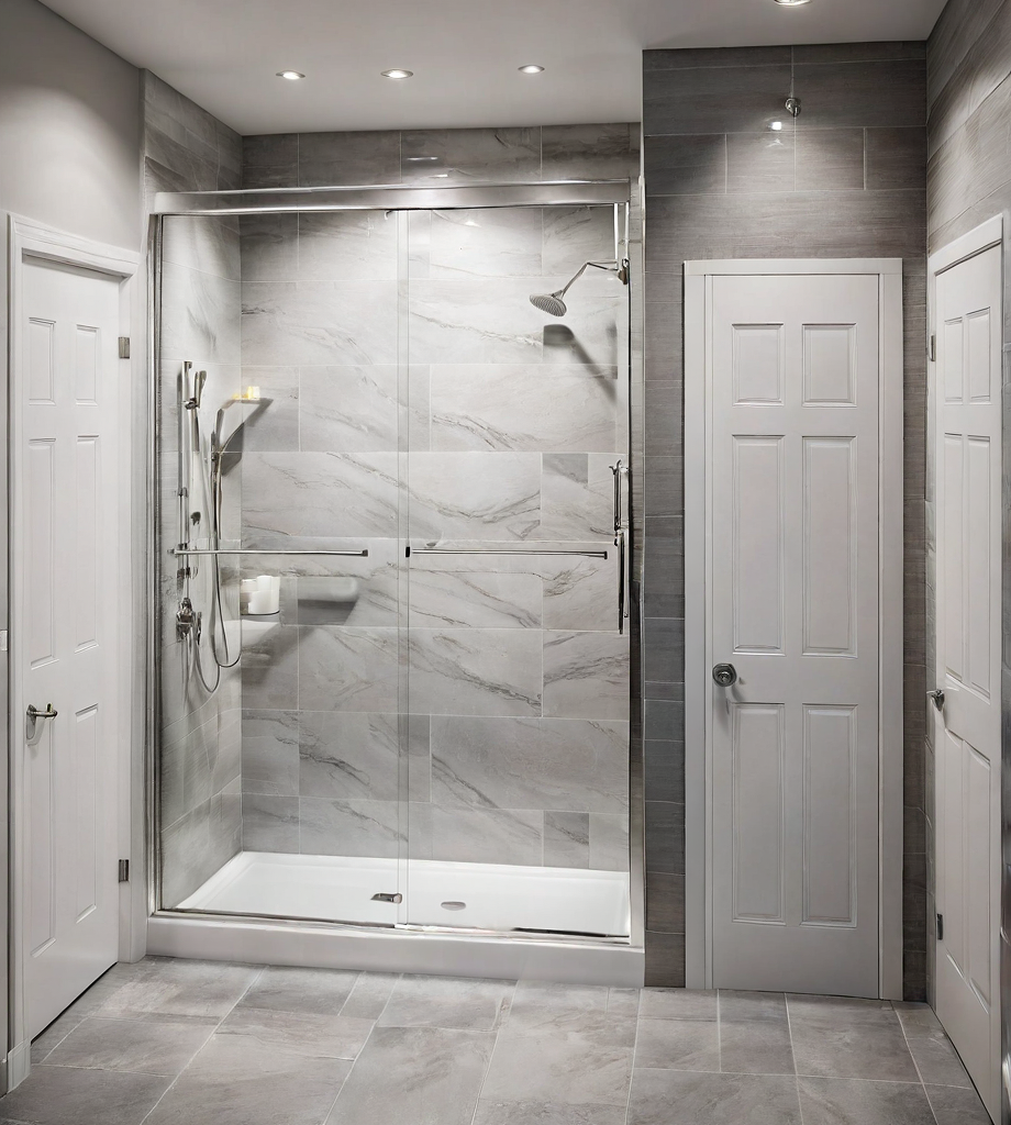 PromptBathroom shower tile with glass door. Gray paint on walls and white closet doors.