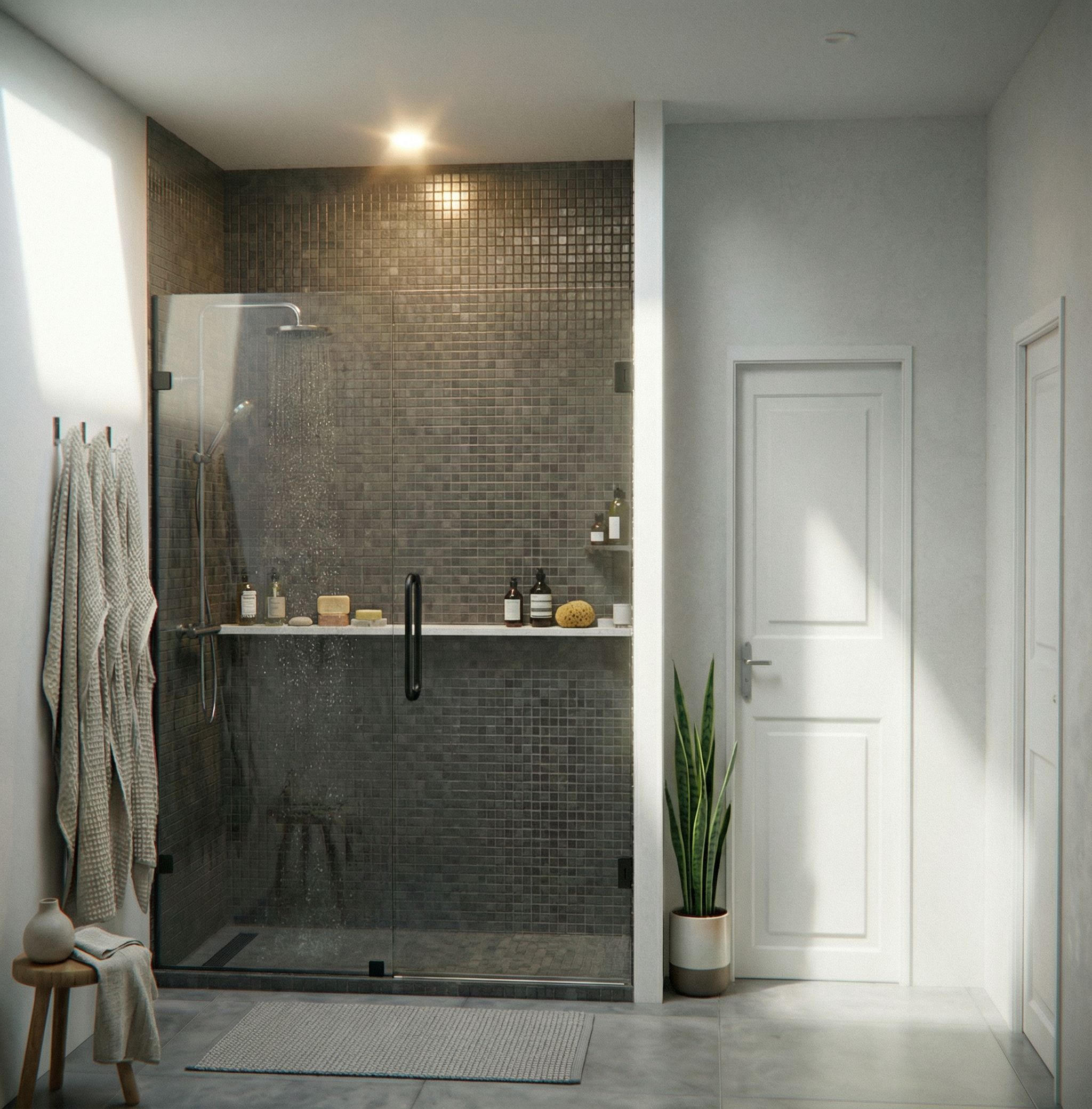 PromptCenter one pot light that is on above the shower, add a full length shower ledge in contrasting colours, add soaps and bottles to the ledge, change out the doors to something realistic with black handles, remove all the plants execpt for one corner slim tall plant between both doors, add a simple but elegant bath mat and any decor that suits the space, keep exact camera angle