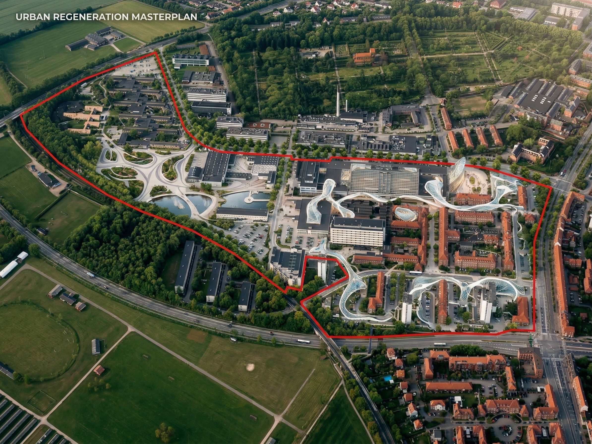 PromptCREATE A MASTERPLAN FOR THIS AREA, MARKED BY THE RED LINE. INSERT URBAN ELEMENTS IN LINE WITH URBAN REGENERATION AND ENVIRONMENTAL REDEVELOPMENT POLICIES. INSERT AND ENHANCE THE ROADS WITH GREEN AXES WITH NEW TREES; INSERT ERGONOMIC CONNECTIONS BETWEEN THE ROAD LEVEL AND SOME BUILDING ROOFS, IN AN ERGONOMIC STYLE, SUCH AS THE WHITE GLASS STRUCTURES IN "REFERENCE IMAGE 1" AND "REFERENCE IMAGE 2". CREATE OUTDOOR SQUARES WHERE THERE IS THE POSSIBILITY OF DOING SO; ENHANCE THE PARKING SPACES WITH A MORE ERGONOMIC DESIGN IN LINE WITH THE CURVILINEAR STYLE OF "REFERENCE IMAGE 1"; MAKE THE STRAIGHT LINES OF URBAN SPACES COMPATIBLE AND CONTINUOUS WITH THE CURVED LINES OF ERGONOMIC INTERVENTIONS; CREATE CANOPIES FOR PARKING LOTS AND NEW SPACES. ON SOME ROOFS OF SOME BUILDINGS, INSERT ERGONOMIC CURVED VOLUMES AS IN "REFERENCE IMAGE 2"., keep exact camera angle