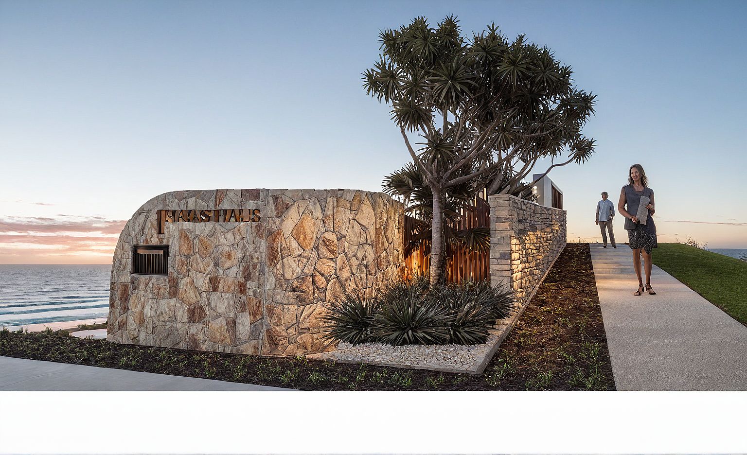 PromptCoastal style front fence with freeform eco outdoor 'wilton' stonework and native australian coastal landscaping