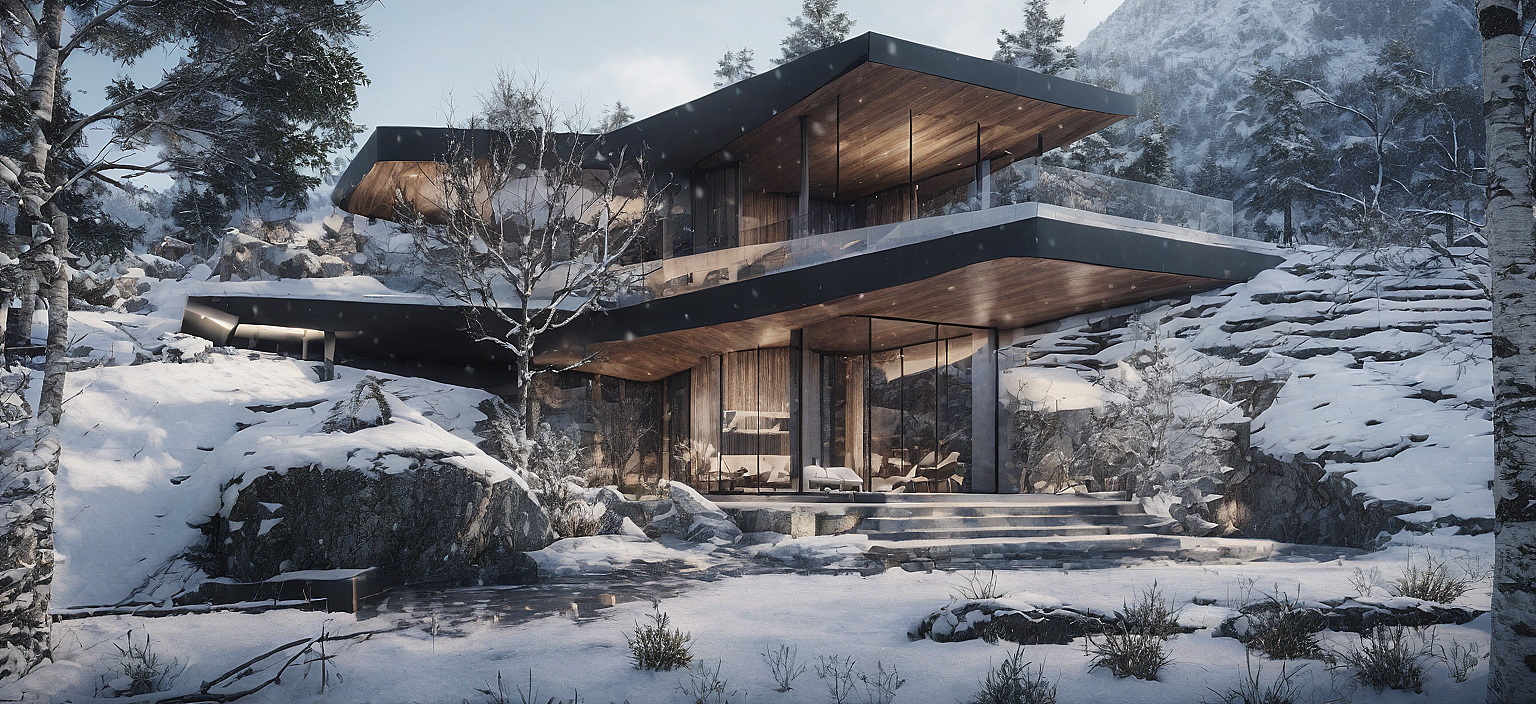 Modern Villa in the middle of snowy mountain