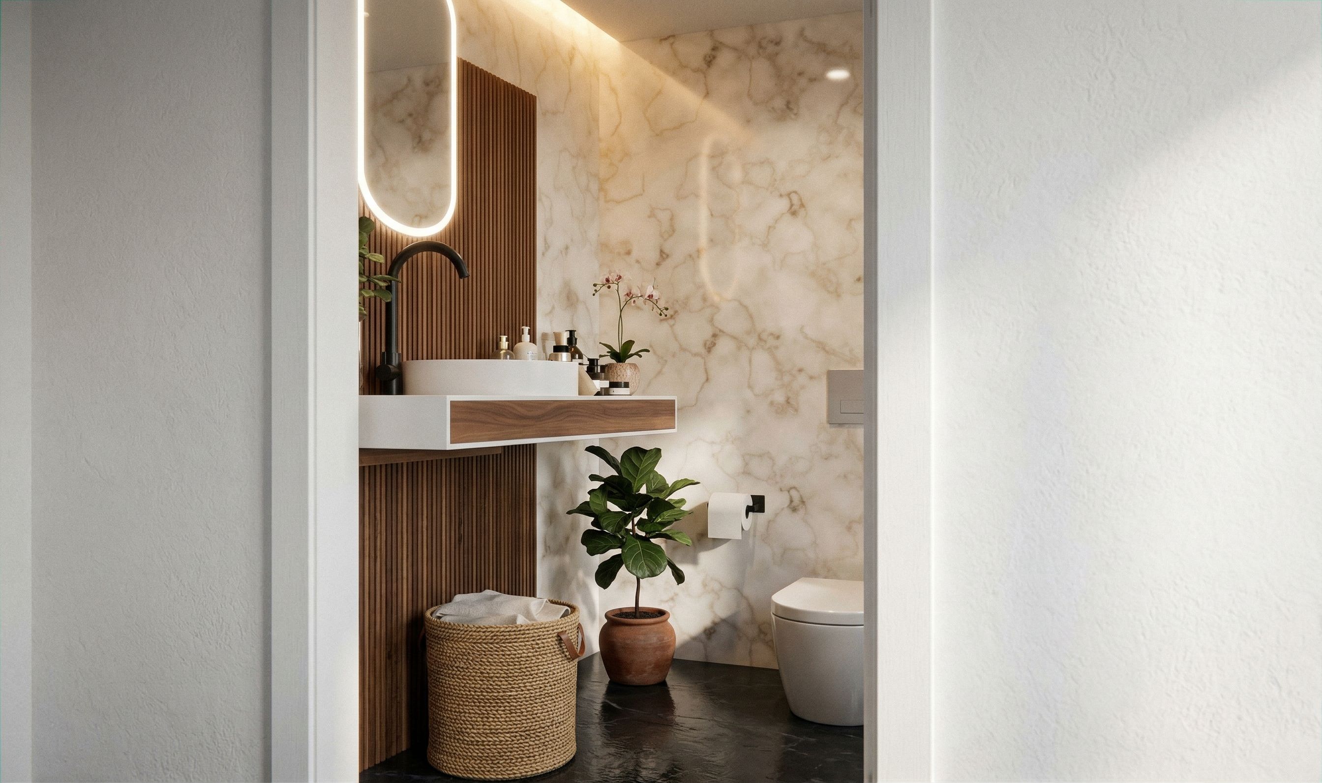 PromptModern beige and white marble tones bathroom with wooden details, keep exact camera angle