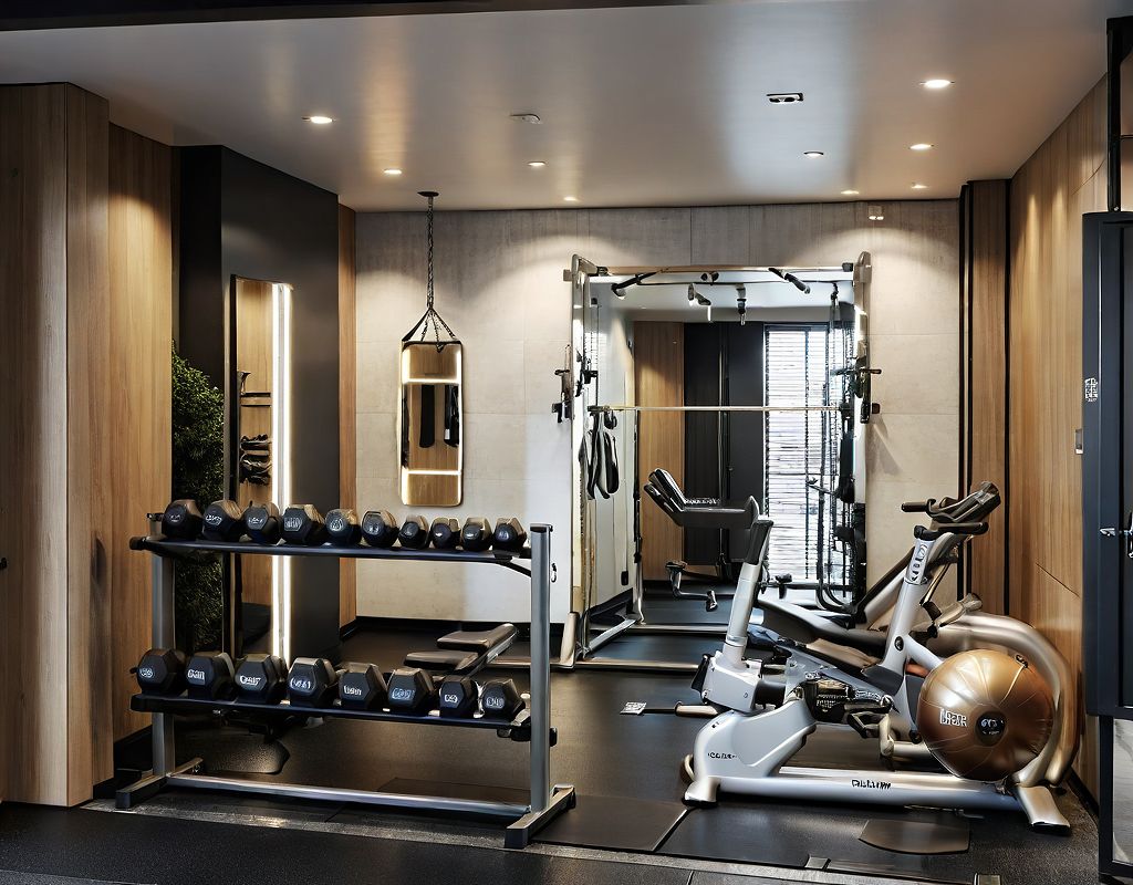 PromptModern gym, industrial aesthetic, well lit and with black cushioned flooring. right wall mirror, light color wall, smtih machine, boxing bag
