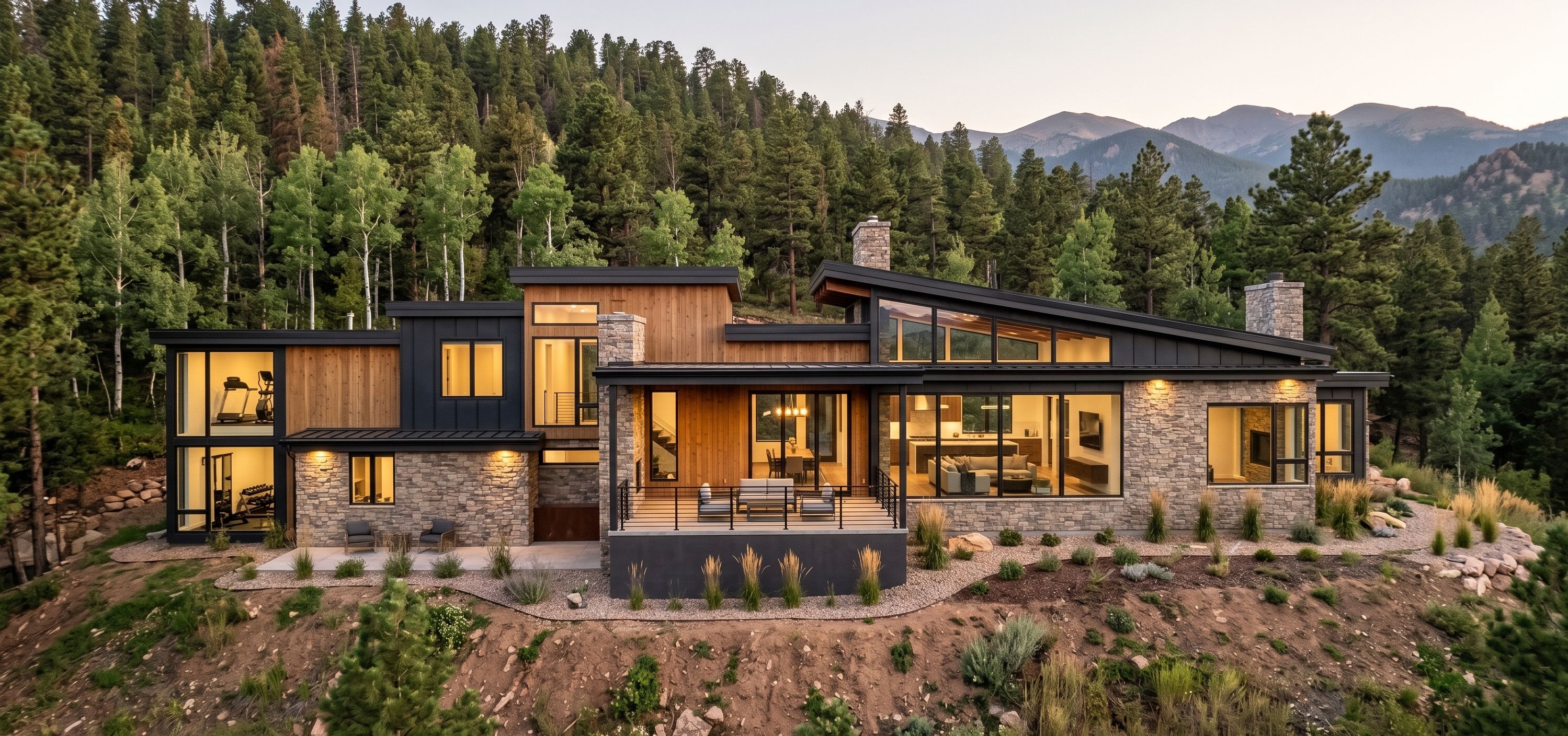 The project is located at 520 Sunny Glen Court in Woodland Park, Colorado. it will be on a hillside looking up the hill with forest far in the back. There will be no basement. Design the home using a balanced blend of natural and modern materials, including Natural stone where stone is shown. Warm stained wood siding and soffits where wood is shown. Dark metal panel where metal is shown along with the fascia's. Overall style should feel like a high-end Colorado mountain modern home— with clean and minimal landscaping keep exact camera angle. The chimneys will be all stone. The room at the left with large windows will be a gym with a cardio area at the mezzanine. The main roof with large sliders will be the living room with kitchen in the back. The room the middle will be the dining room. Minimal and clean landscaping around the house. , keep exact camera angle