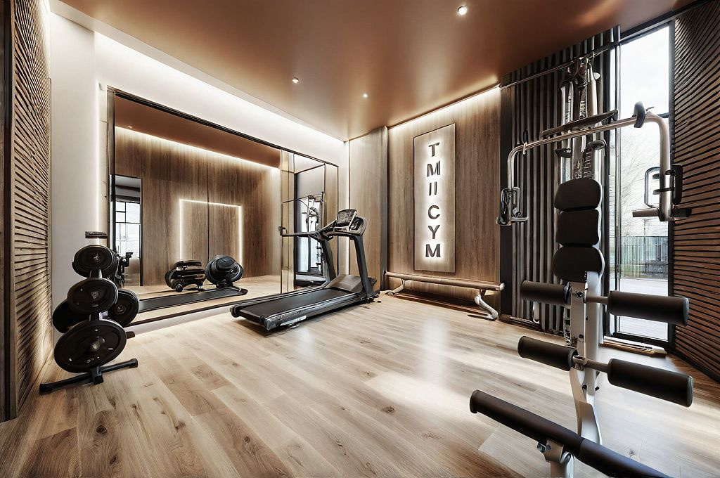 Prompta modern gym with open to exterior on the left, and mirros on the right, with leds on the roof