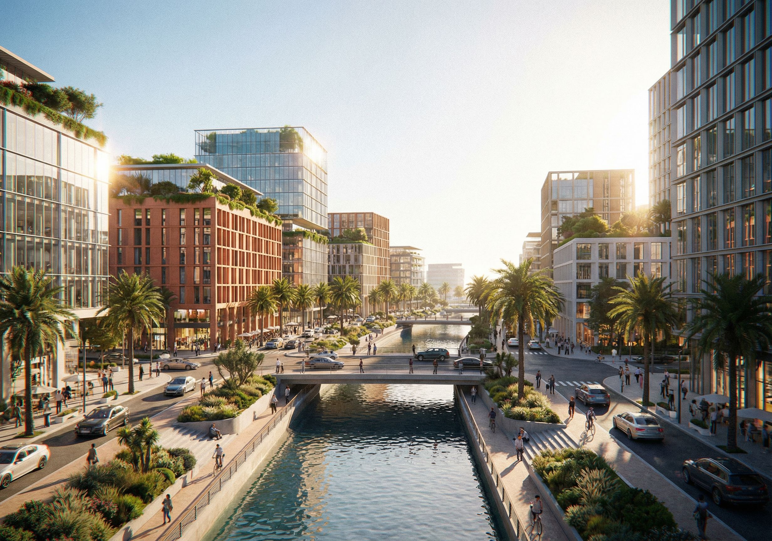 Promptinnovation district, with mixed use buildings and strip parks, in Bahrain