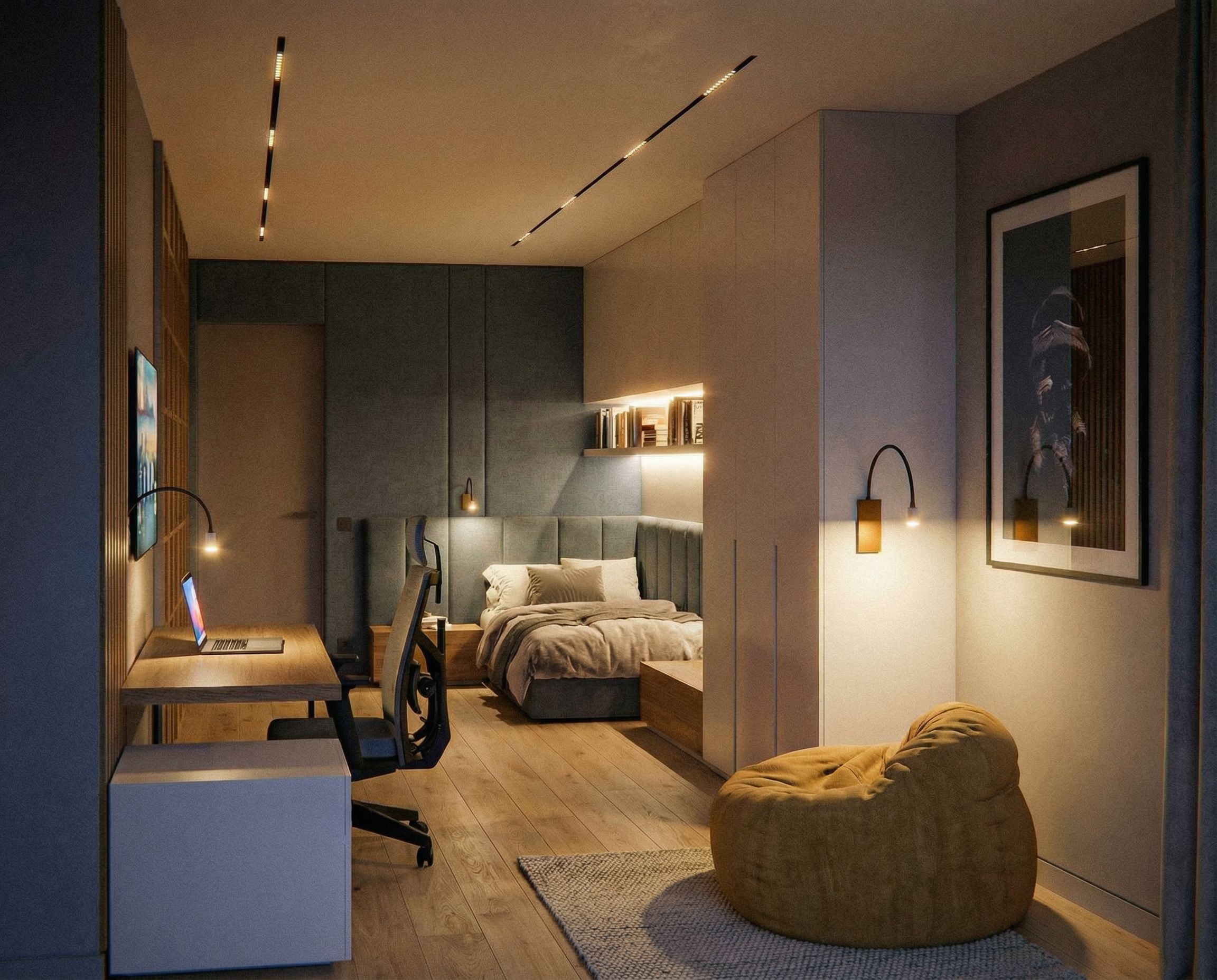 PromptYou are professional photographer and expert architect, you role is to transform the input into realistic photograph and add photography effects like chromatic abberation, ISO noise, Film grain, Sharpening pass, Soft glow, Exposure correction, Tone mapping, Bloom + glare mix. Composition: Always keep same input composition and camera angle, accordingly NEVER EVER crop the input or change the angle unless otherwise is mentioned in the user instructions regarding camera angle or composition. For example: if input is a tower, it should be fully visible. Additional guidance: consider the user instructions provided below to help you. Text: if input contains text, ensure to render it correctly. Errors: final output should be 100% correct without any errors or strange things. Input type: you are expected to handle different input types like clay model inputs, freehand sketches, photos, you have to think first how to transform each one into an ideal photograph Creativity and adding details: exteriors: add elements like landscape, context if needed to make the scene perfect award-winning shot. interiors: materials, textures, interior accessories,..etc. Final Result: final result quality always should tend to look like a realistic photograph unless user specifies different style below. User Instructions: "TEENAGER ROOM, LIGHT OAK FLOOR, COZY LIGHT, DAYLIGHT, A SMALL CARPET, A PICTURE ON THE WALL OVER THE ARMCHAIR, KEEP THE WALL TEXTURE IN DARK GREY BLUE TEXTILE, PUT BOOKS ON THE SHELF AND A LAPTOP ON THE DESK, MAKE THE POUFF MUSTARD COLOUR, KEEP THE COLOUR OF THE BED TEXTILE WARM GREY, keep exact camera angle. Type: interior design. Input: photograph. Lighting: night scene with ambient lighting"