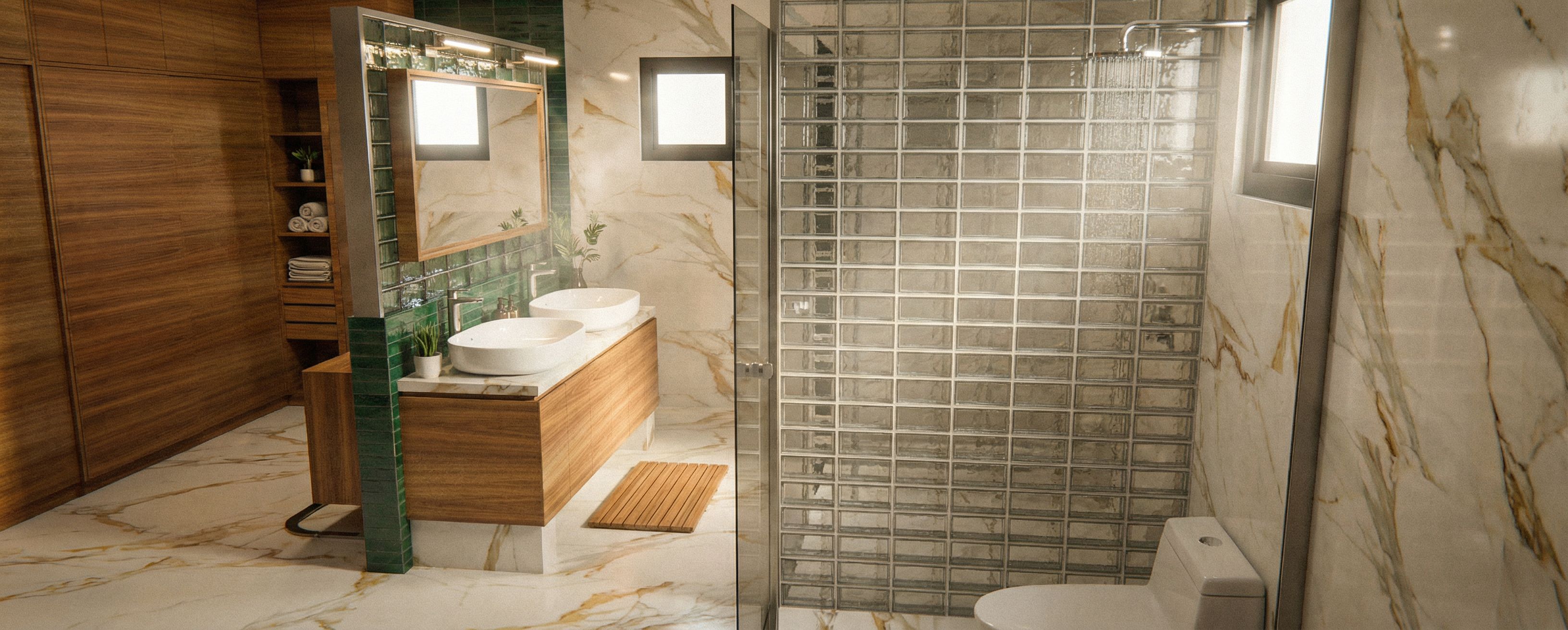 PromptJapanese inspired modern toilet, oro calacata floor, wall tiles and countertop, glass bricks, green accent tiles, stainless trims and fixtures, rains shower, glass doors , keep exact camera angle