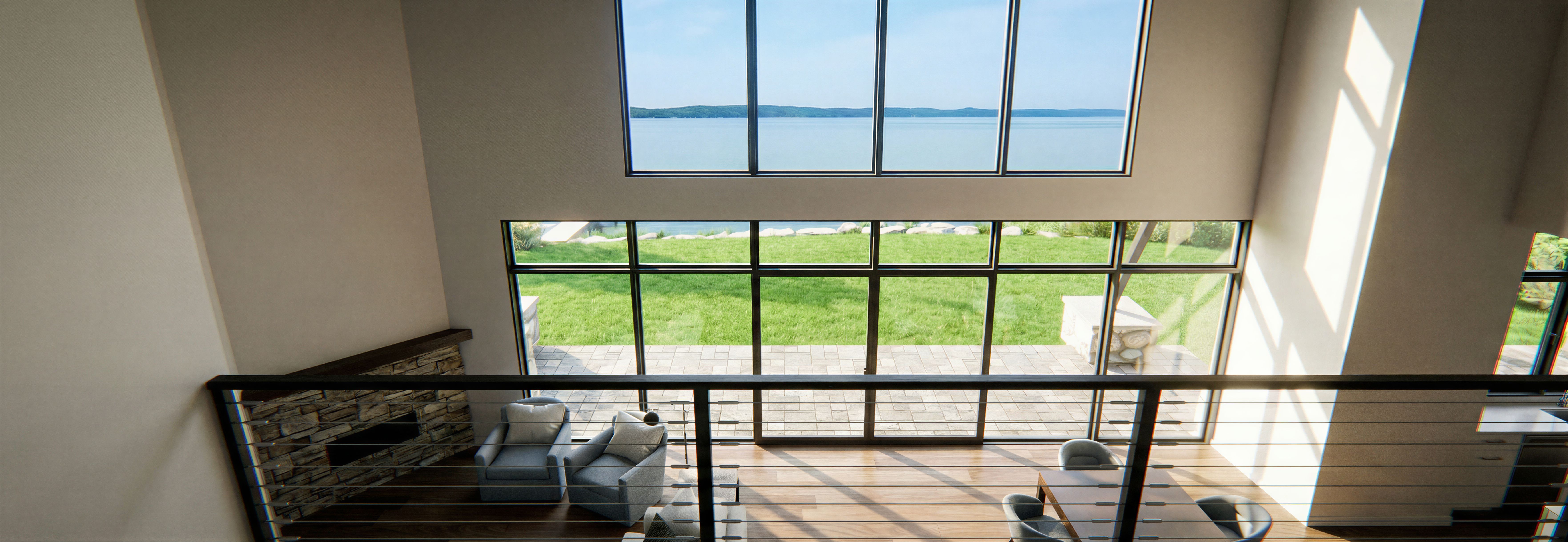 create photorealistic rendering of the room, lawn view through the glass door and lower windows, lake view through the upper four windows per Reference Image 1, keep exact camera angle, do not crop the image, keep exact camera angle
