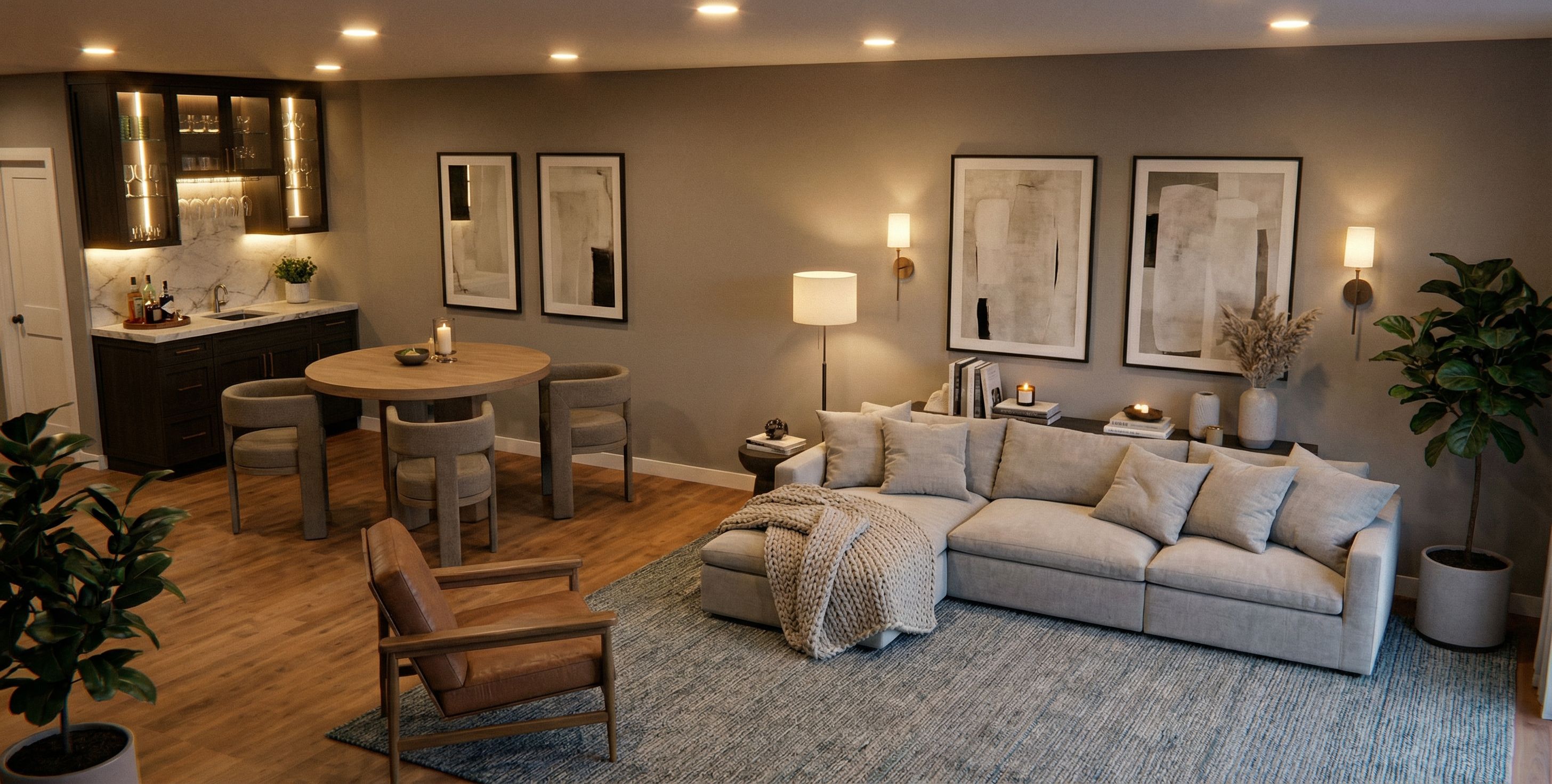 Photo of a cozy, modern basement living space featuring an open-concept design. Highlight the stylish sofa with soft cushions, a minimalist wooden dining table surrounded by sturdy chairs, and a sleek bar with dark cabinetry. Emphasize warm wooden flooring and a textured area rug. 6 overhead pot lights that are on, cozy wall lighting or lamps, Capture the scene from a slightly elevated angle, using a wide-angle lens to enhance the spaciousness and inviting atmosphere of the interior., keep exact camera angle