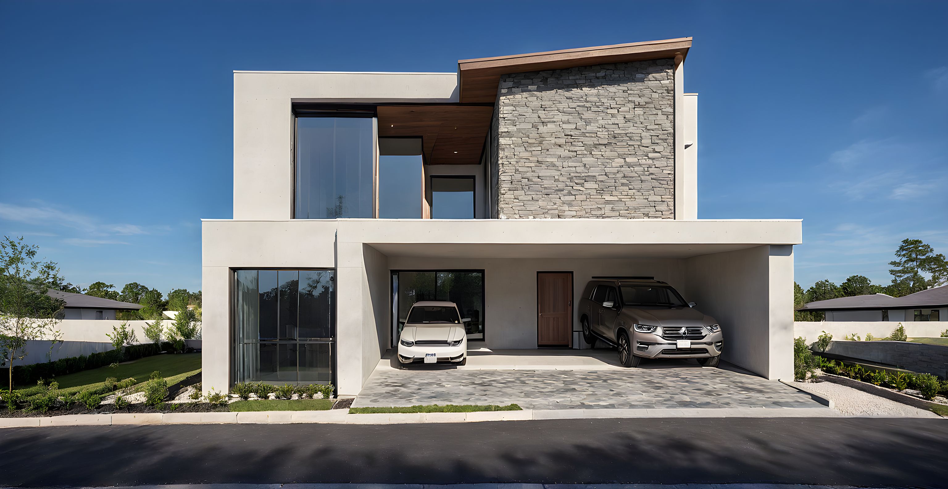PromptPhoto of a contemporary residential building, featuring a combination of smooth stucco and textured stone façade, highlighting geometric shapes and open spaces. Located in an urban setting with nearby low-rise structures and green landscaping. Captured in bright daylight, enhancing the natural textures with soft shadows. Perspective from a slightly low angle to emphasize the height and angular roof design, using a wide-angle lens to encompass the carport area and adjacent vehicles, creating a dynamic and inviting atmosphere.