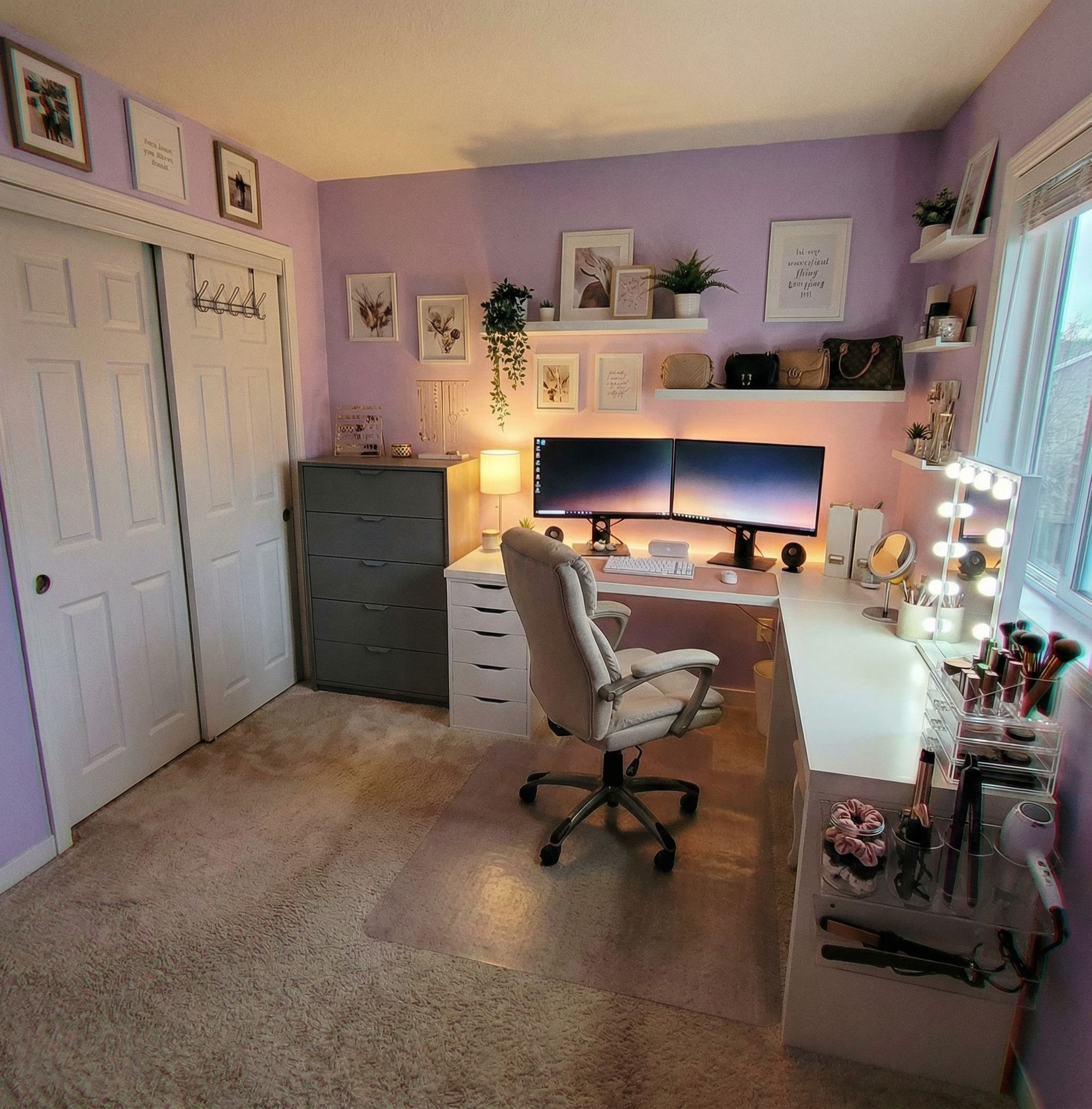 PromptI want to see what’s on every wall. Make the dresser bigger width and height and dark gray. I need something to put my bathroom stuff like hair tools and scrunchies and jewelry. , keep exact camera angle