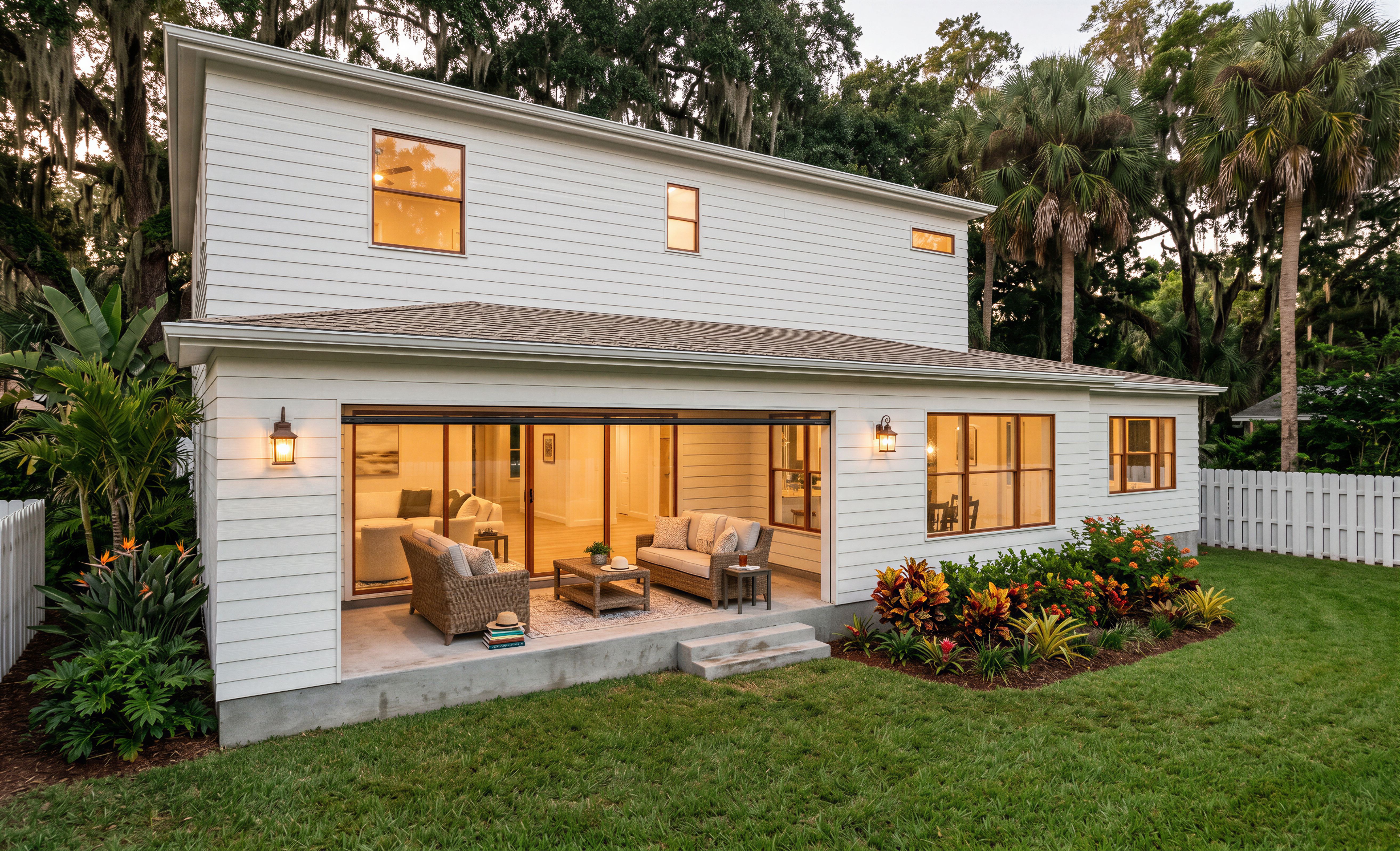 EnhancedPromptMake photorealistic renderings of this house image; Grass in the front, flower bed to the right of the concrete steps, tall planting on the left side of the house, between the house and the left white fence, make flower beds typical for Florida; Trees on the left and right of the house in the background, deciduous tree types typical for Florida; Add exterior light fixtures where appropriate, exterior lights are on; Lights on in the interiors; The outdoor room is Lanai type, make it feel Southern, add furniture and misc. items per Florida look, add rolled up screen; Keep existing doors, Keep existing windows, Do not change windows to doors; Do not change doors to windows; There is no opening on the left side to the Lanai room; Morph the image from the Reference Image 1 as a background behind the house, do not show street sign, do not show Stop sign, delete street sign, delete stop sign; keep exact camera angle, keep exact camera angle