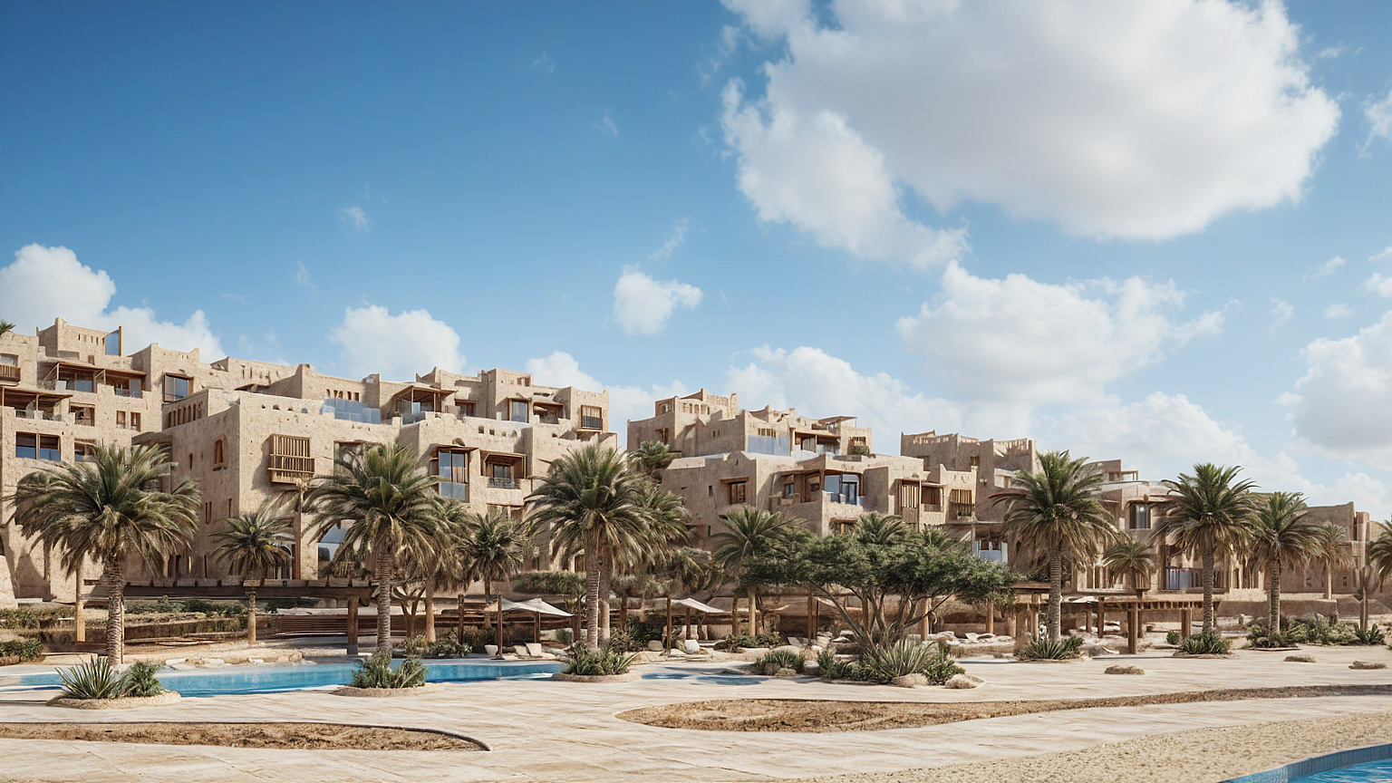 Promptmud facade and rock facade with wooden mashrabiya windows make look realistic with beach pool in the middle and sand in between