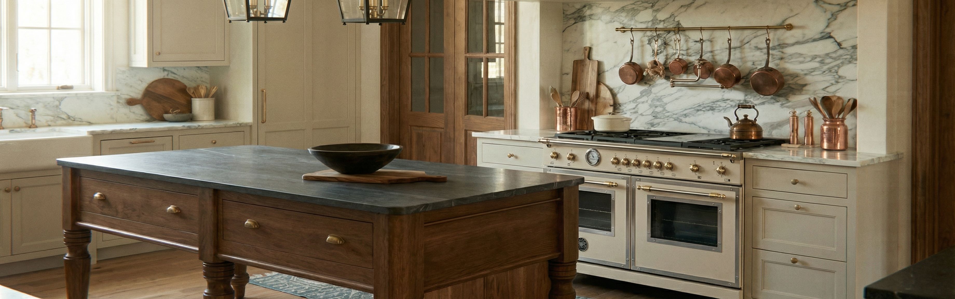change range to the reference photo, Make the kitchen island have grey soapstone countertops.make the kitchen island like the reference photo but add grey soap stone countertop, keep exact camera angle
