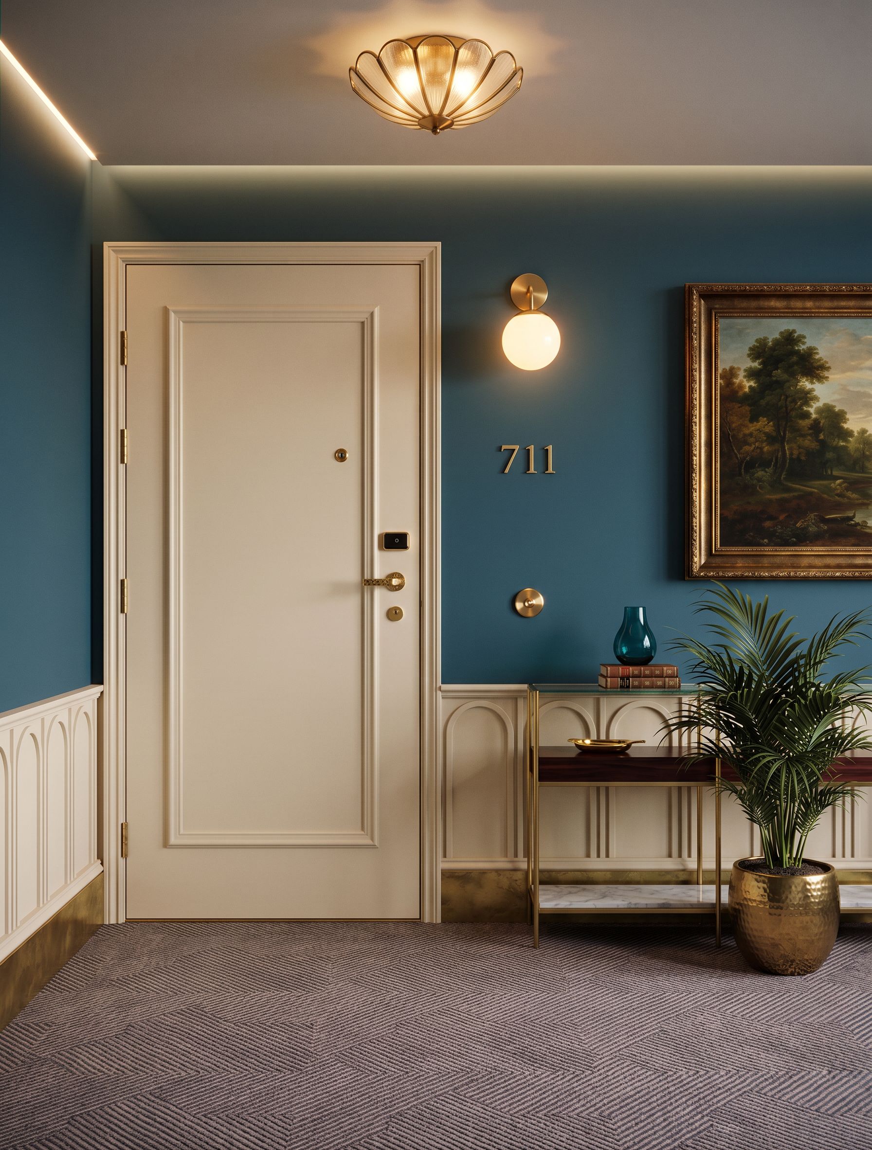 Colorize this image of a corridor door using the reference image as inspiration. Add new details such as a ceiling light, a new sconce to replace the one there and unit numbers. Change the moulding to match the reference image. Change the piece of artwork to be the one shown in the reference image or similar. Keep the same angle and view extents., keep exact camera angle