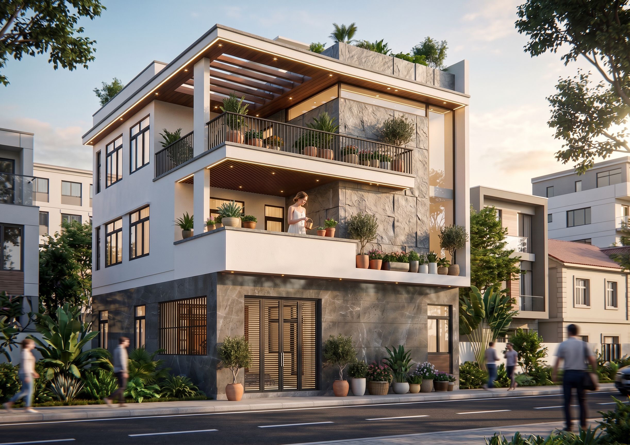 PromptThe original design of the house was preserved, along with all the materials and lighting system. The lighting system was simulated to be more realistic. Many potted plants were added to the balcony, and a girl in a white dress is seen tending to them., keep exact camera angle