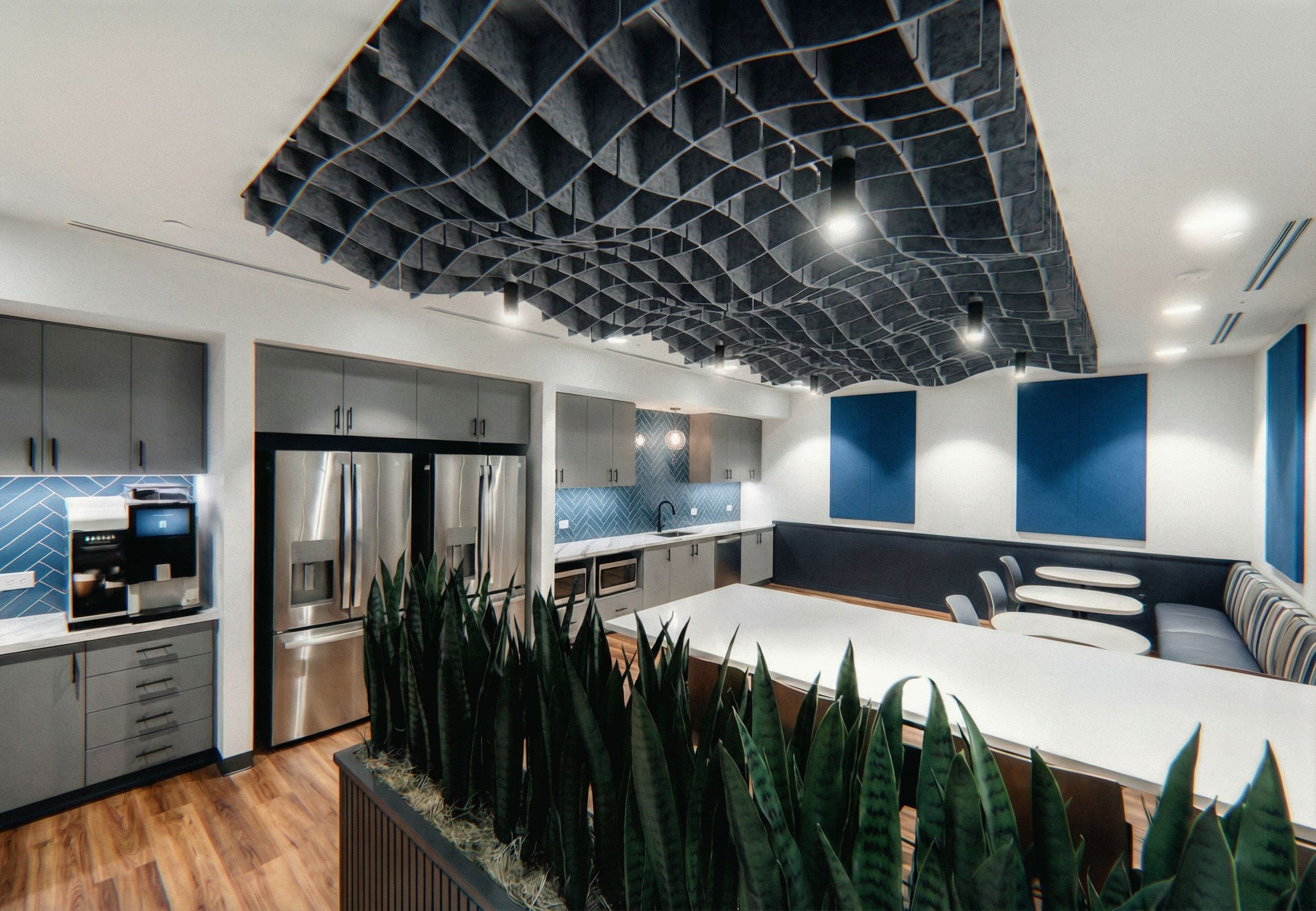 Promptmake the blue tile herringbone pattern. add a couple blue acoustic wall panels along the white portion of the wall to the right, keep exact camera angle