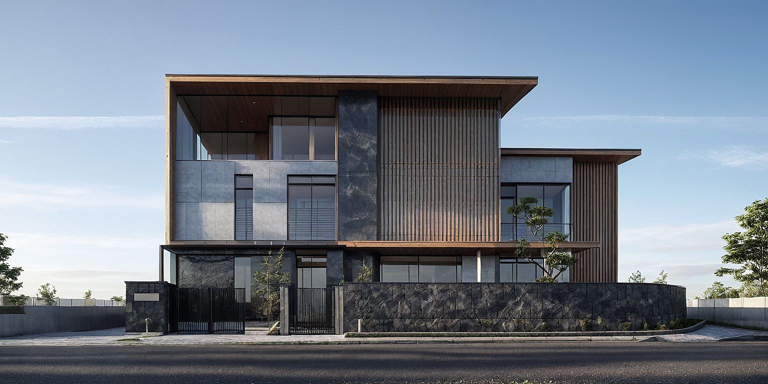 Prompt"A contemporary two-story house with a minimalist and elegant design, photographed in daylight. The building features large floor-to-ceiling glass , smooth light gray panels on the facade, vertical dark gray marble strip accent, and natural wood vertical slats for shading. The flat white overhanging roof adds a modern touch. The house is set on a corner plot with a low, dark stone boundary wall and integrated gate. A well-manicured bonsai-style tree is visible through the central glass section. Clean street-level perspective with neutral sky background, soft natural daylight highlighting the textures and tones."