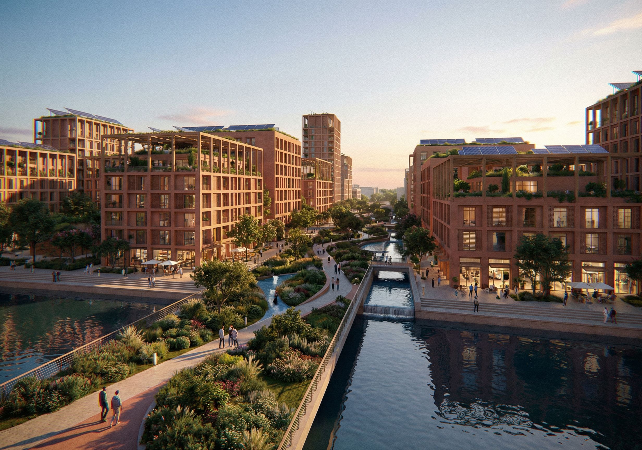 innovation district, with indigenous sustainable mixed use buildings and landscaped bridge pedestrian parks, in Bahrain