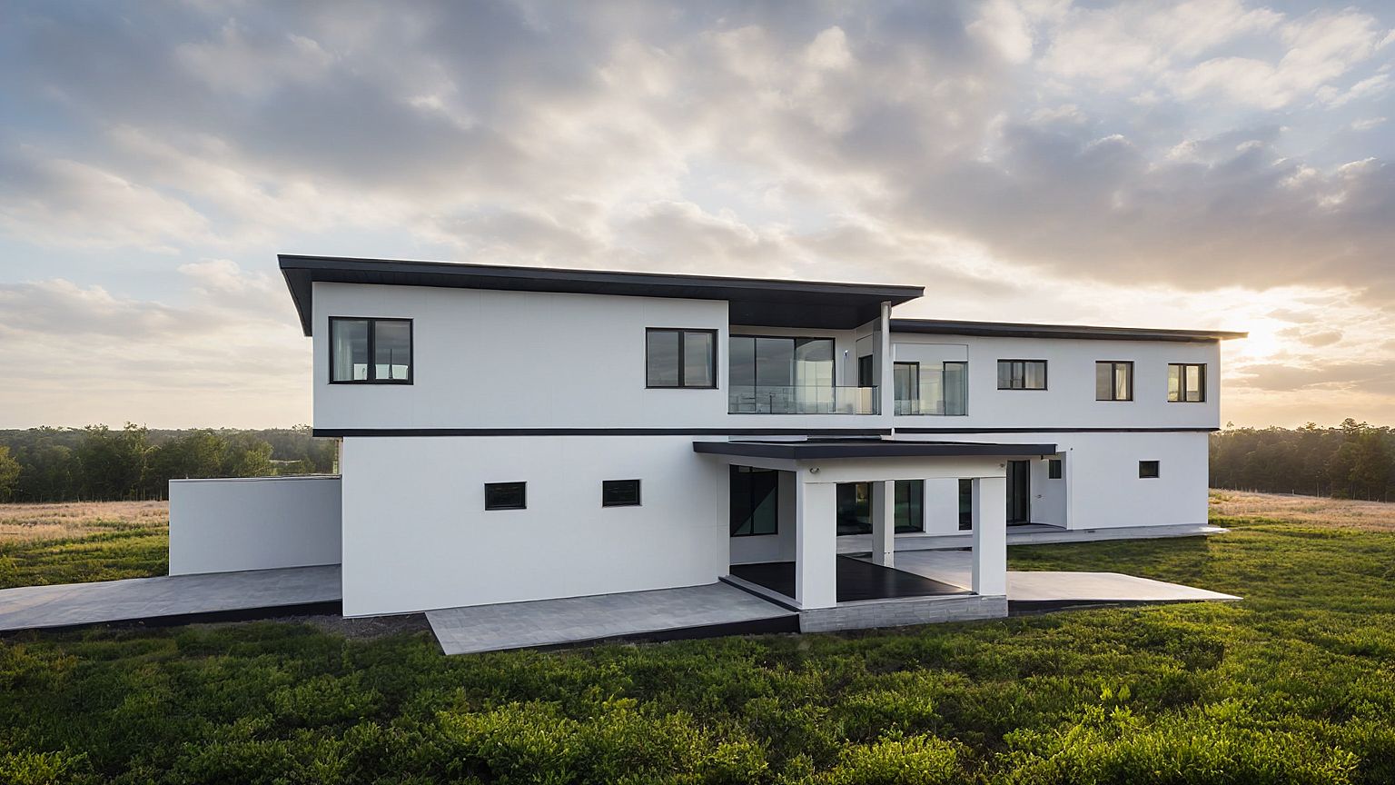 PromptPhoto of a modern residential building featuring sleek lines and a mix of bright white walls and dark glass materials. The structure exhibits large windows, accentuating transparency and light. Surrounded by a spacious, open landscape , apply vegetation and trees, the scene emphasizes a calm suburban setting. Soft, diffused daylight during early morning casts gentle shadows on the façade, enhancing architectural details. Captured from a low angle to accentuate the height and design elements, with a wide-angle lens to encompass the broad surroundings, creating an inviting and airy atmosphere. Include surtains at windows. use interior warm lights and exterior wall lights to blend early a dawn feel.