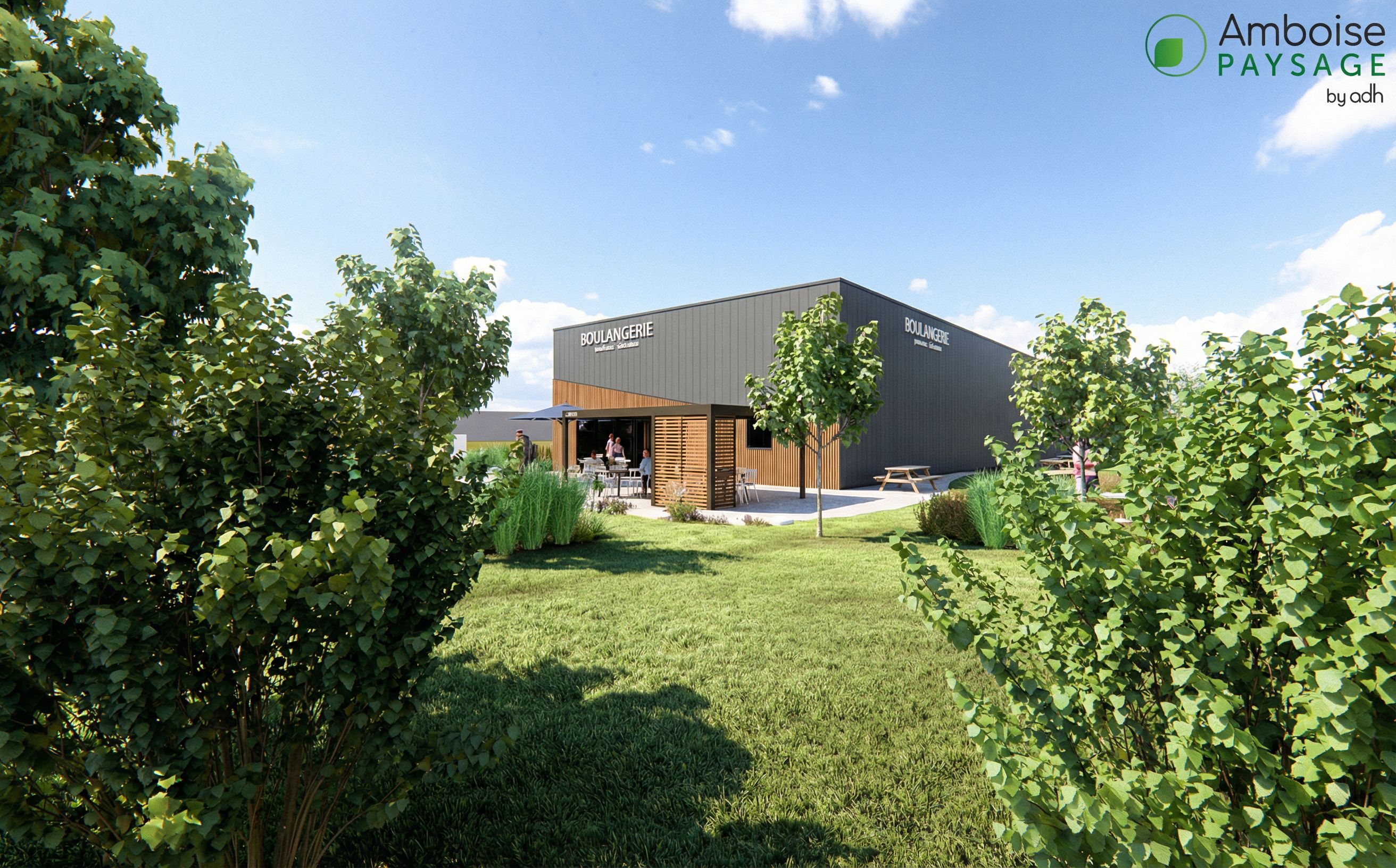 keep the composition, keep the position of the vegetation and the different elements.keep the text make the render more realistic. for instance, replace the vegetation and the materials of the facade. the project is about a pergola and landscape, you can keep the building as represented in the file attached existing situation . the structure of the pergola is in aluminium RAL 8024 with blades in aluminum imitating wood. The existing building has wood on the triangle basement. the rest of the building is in metal cladding similar to the picture attached., keep exact camera angle