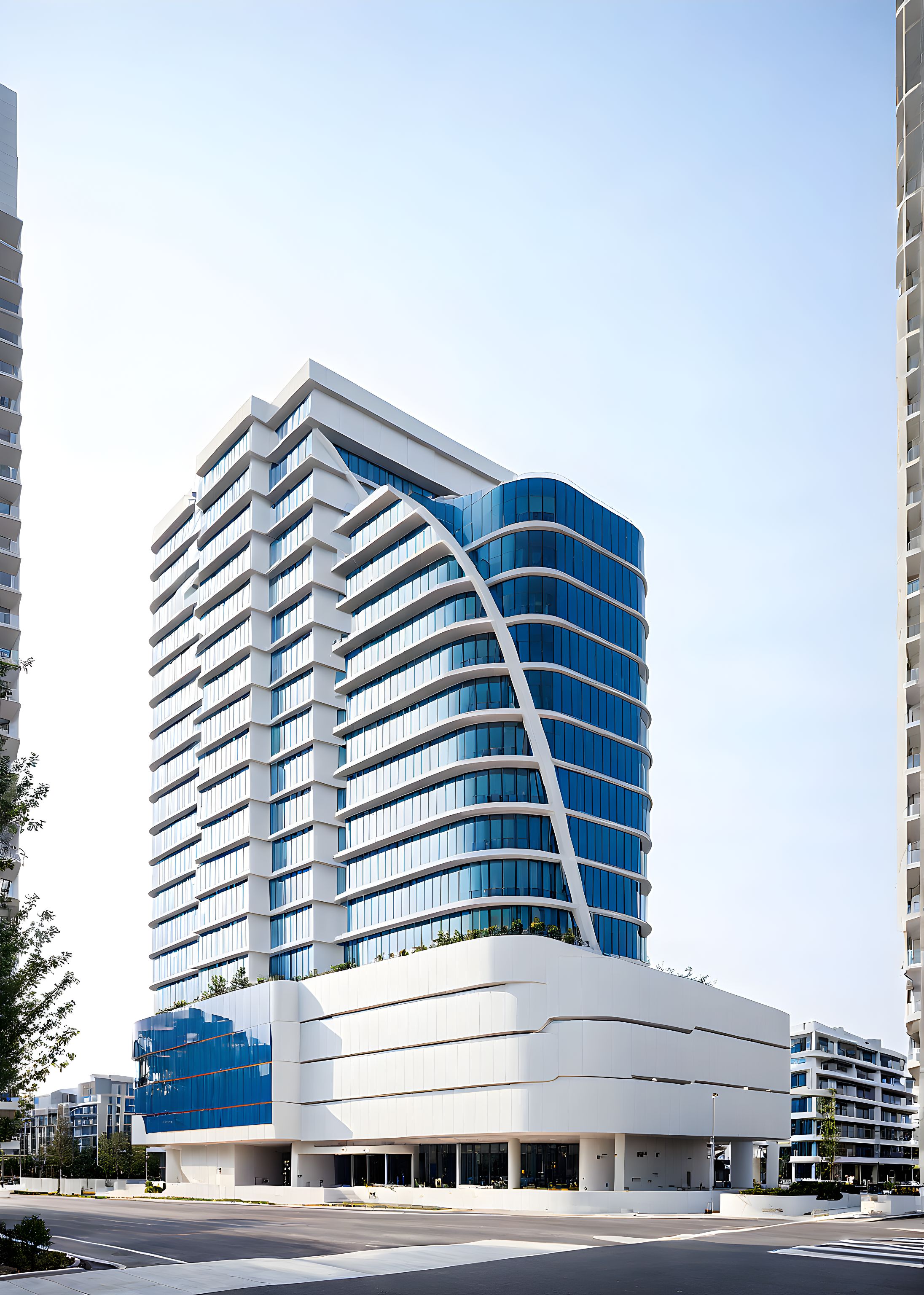 Photo of a modern high-rise building with sleek, curved design elements featuring a striking blue accent. The facade showcases smooth, white surfaces with horizontal and vertical lines that convey contemporary aesthetics. Surrounded by an urban landscape, with nearby low-rise structures offering contrast. Bright, natural lighting enhances the building's features during the day, casting gentle shadows. Captured from a low angle with a wide lens perspective to emphasize height and uniqueness, creating an impressive visual impact.