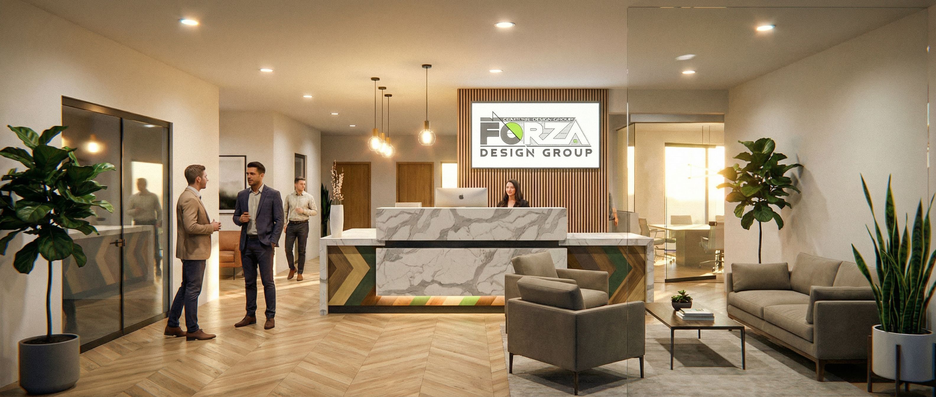 Promptswitch flooring to light wood in chevron pattern, offices in back have windos want some light coming through those lites., keep exact camera angle