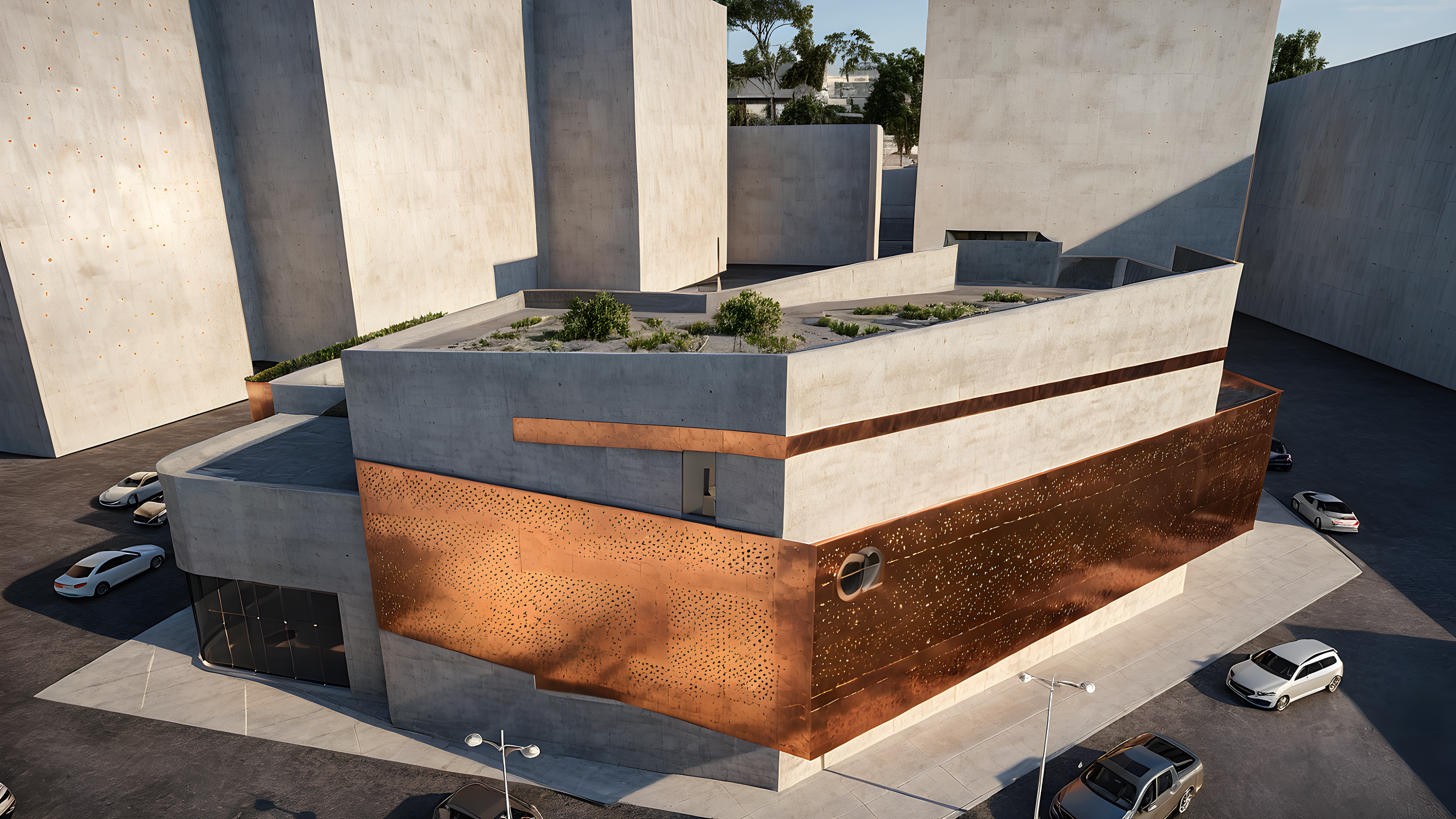 FACADE OF POLISHED CONCRETE WITH A COPPER PANEL WITH RECTANGULAR HOLES