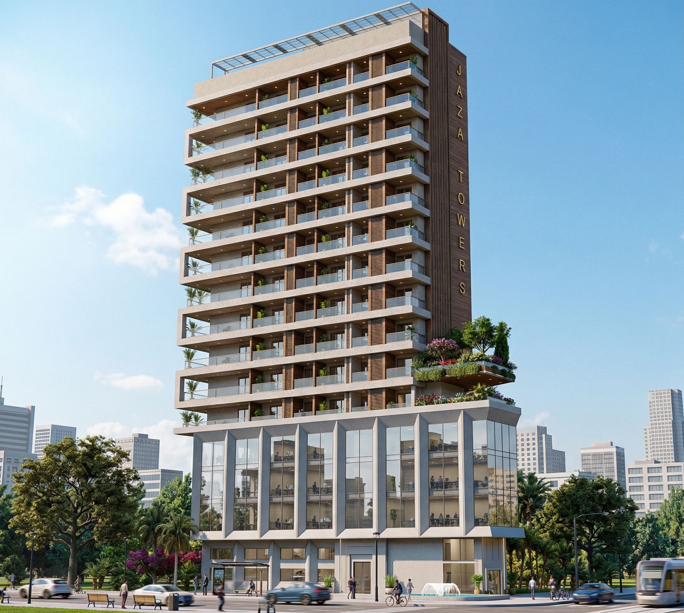 a super realistic render of a high rise residential cum commercial building with a nice cityscape, keep exact camera angle