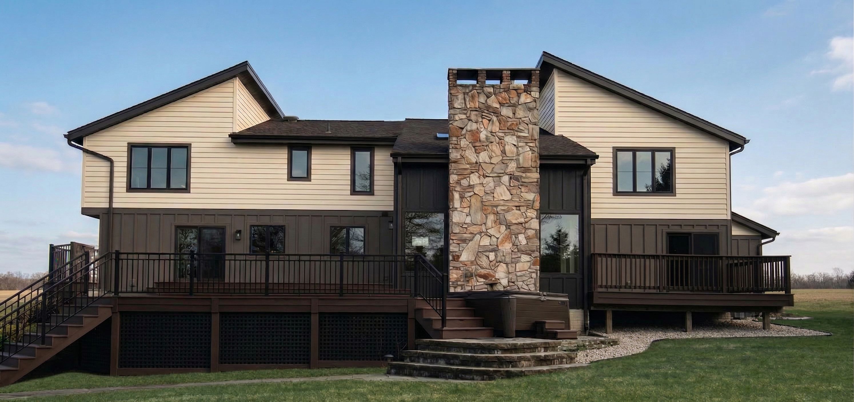 Bring the black board and batton to the roof on either side of the stone chimney, above the 2 windows. remove the bay window on the right second floor, and replace with a standard window, same style as the rest of the windows. Remove trees and bushes. keep everything else the same. , keep exact camera angle