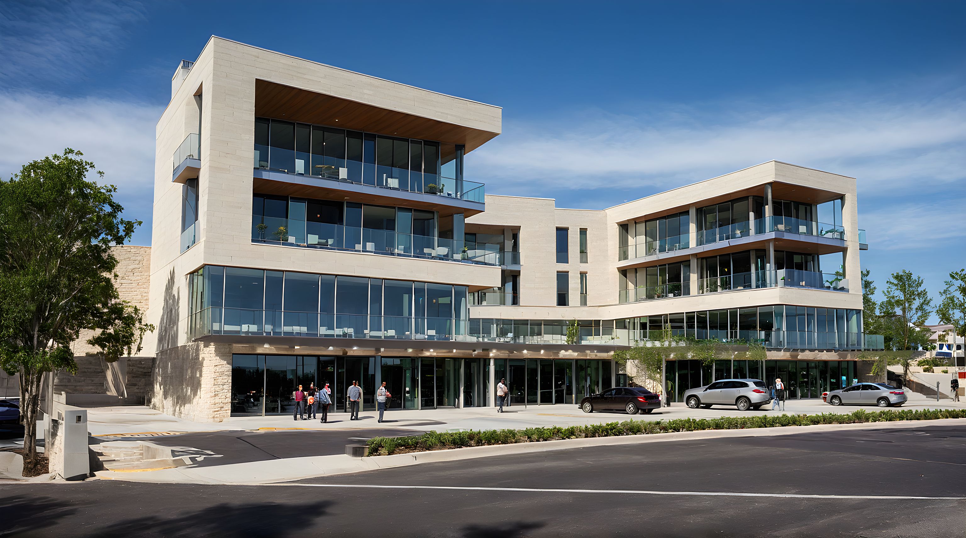 PromptPhoto of a contemporary mix-use Food & Beverage building with layered balconies and expansive glass walls. Emphasize the travertine stone facade, sleek railings, and vibrant greenery at the entrances. Set in an urban context with nearby pedestrian activity and vehicles in the foreground and on the right with steep slope street. Soft afternoon light casts natural highlights, accentuating structural forms. with partly cloudy skies. Captured from a low angle, utilizing a wide-angle lens to enhance depth and provide a dynamic perspective of the architectural features. Add cars, people, and outdoor furniture