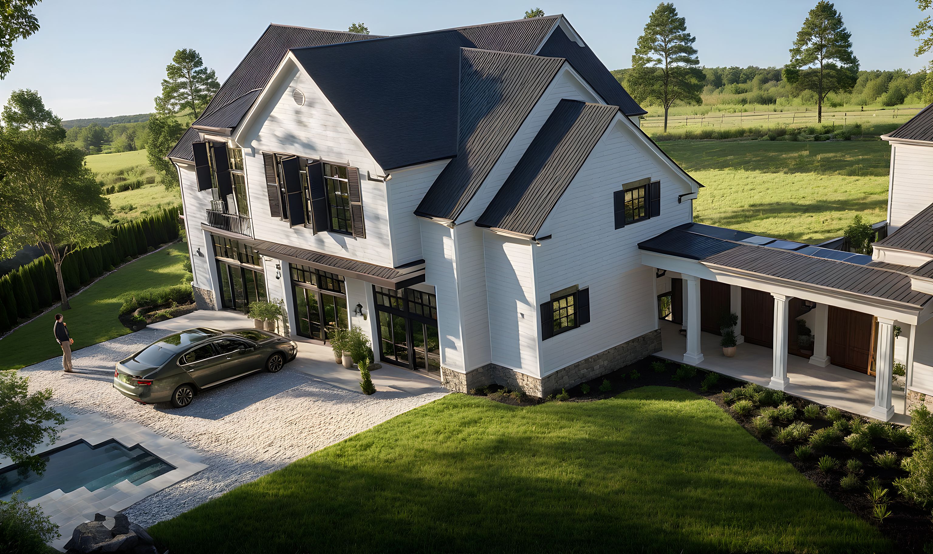 PromptPhoto of a charming modern farmhouse, featuring a symmetrical façade with gabled roofs, large windows, and a welcoming front porch. Elements include wooden siding, a stone foundation, and intricate detailing around window frames. Set in a lush green landscape, surrounded by tall trees and a nearby pool with a pergola. Soft afternoon light casts gentle shadows, highlighting textures and materials. Captured from a slightly elevated angle, emphasizing depth and framing with a wide lens to encompass both buildings and the inviting outdoor space. grass with English Baroque landscaping sun shining