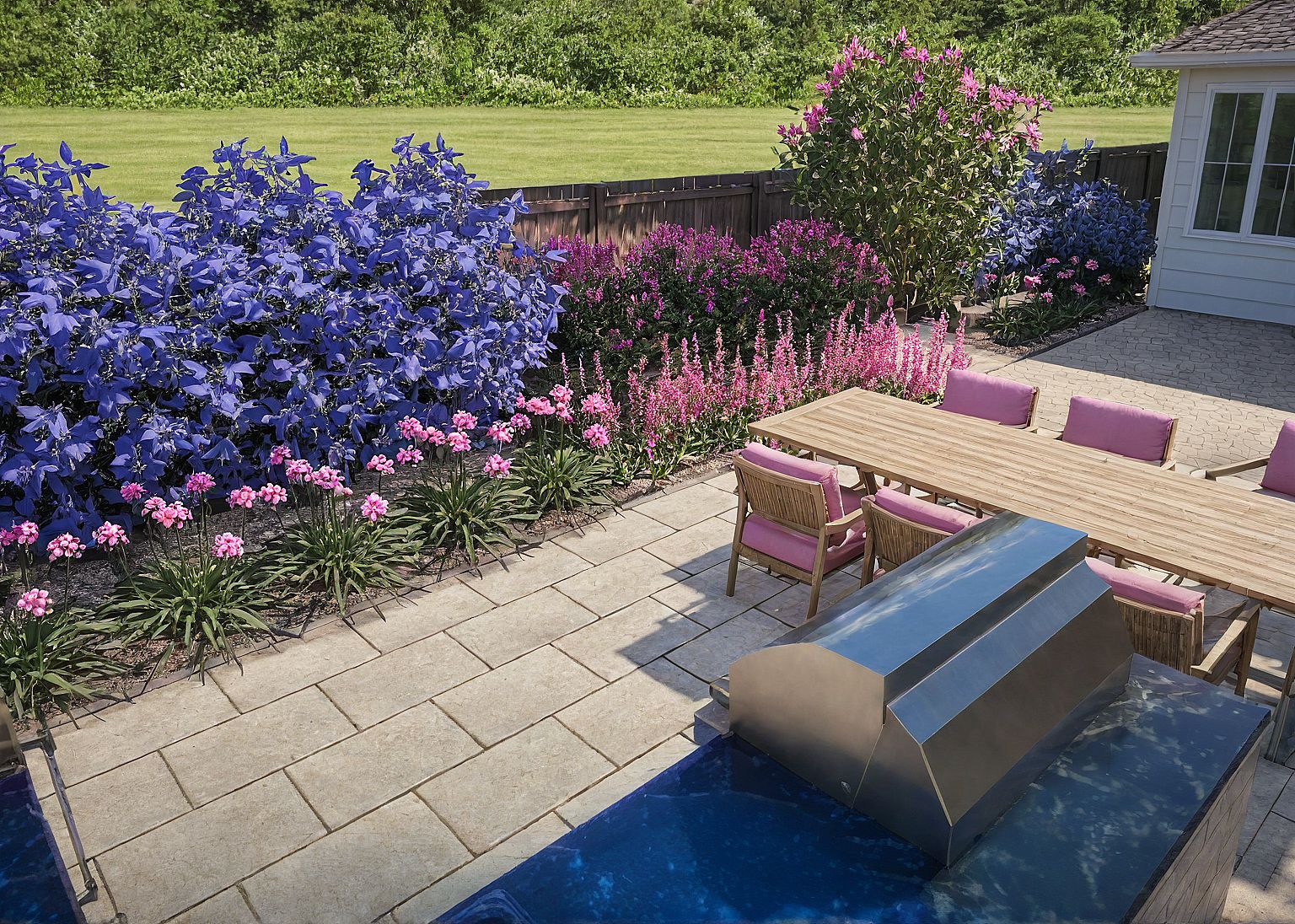 Promptmake this photo realistic, blue salvia, outdoor kitchen, pink shrubs, lily of the nile