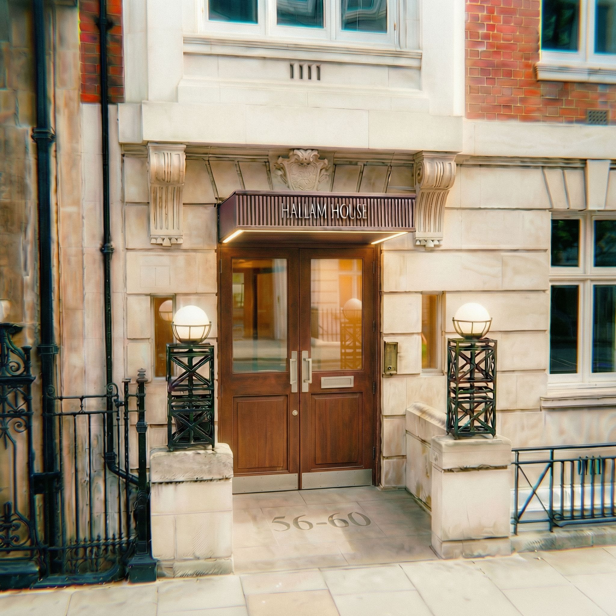 Promptclean up stonework on facade and balustrade, make door ironmongery brushed light Nickel, show some light behind glass of door, put light to strip on underside of canopy, keep exact camera angle