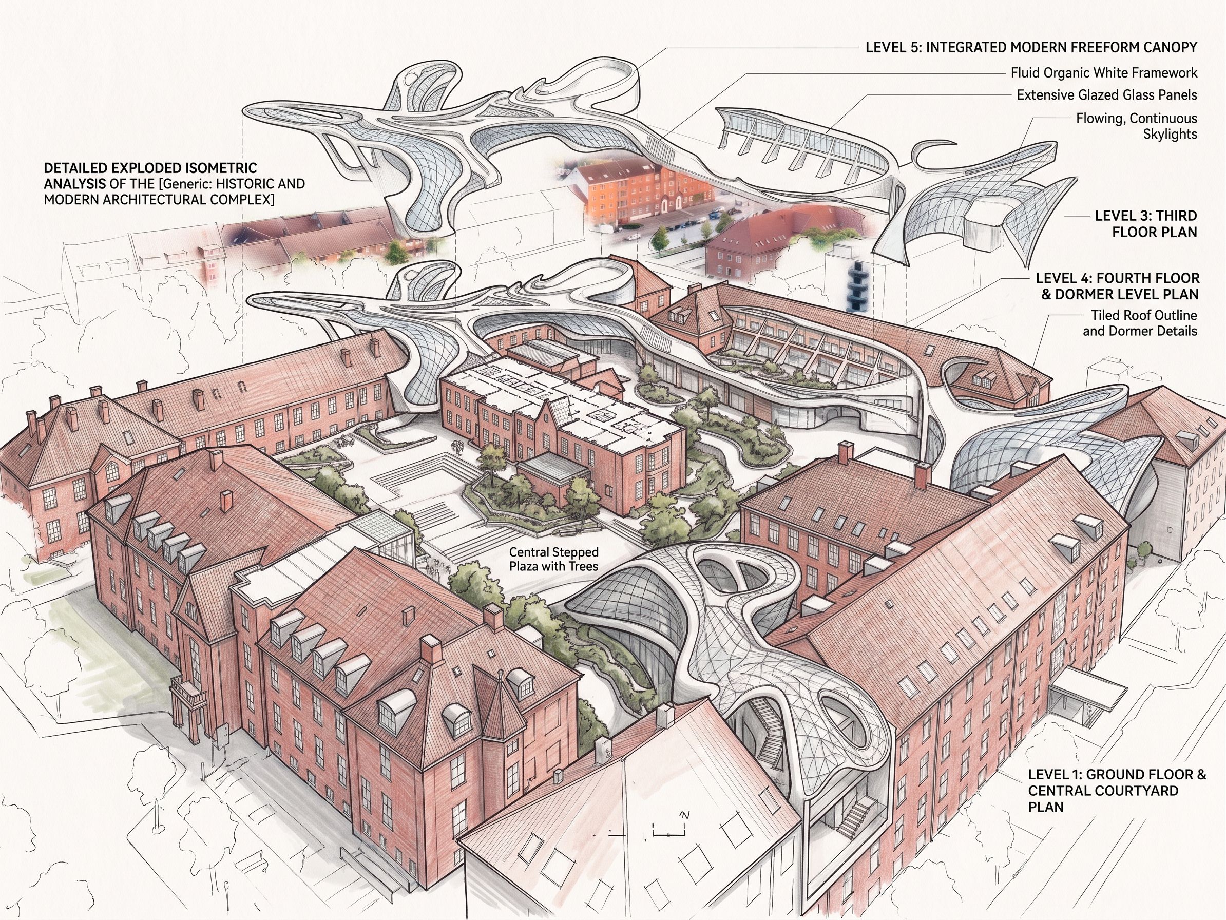 Create an ideogram based on this image, in detail, of a 5-level exploded isometric view, separated by white space. The plans for the first 4 levels are similar and contains only one floor; the roof will be identical to the white glass roofs shown in the figure., keep exact camera angle