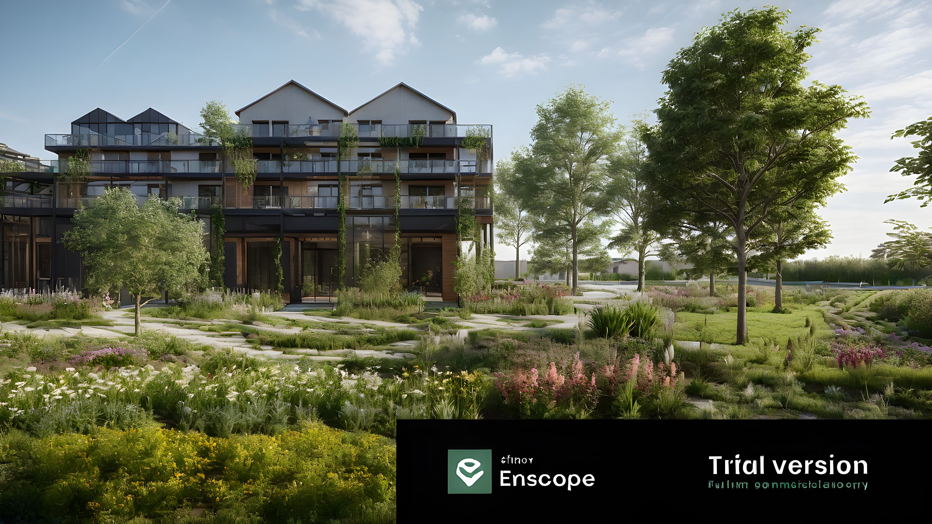 PromptA natural landscape sloping downwards to the right of the image, with pathways, different size plants and flowers, trees , some community gardens to the right, a green corridor filled with nature, and a small pond in front of the buildling, two sotry residential buildings on the right side, urban context