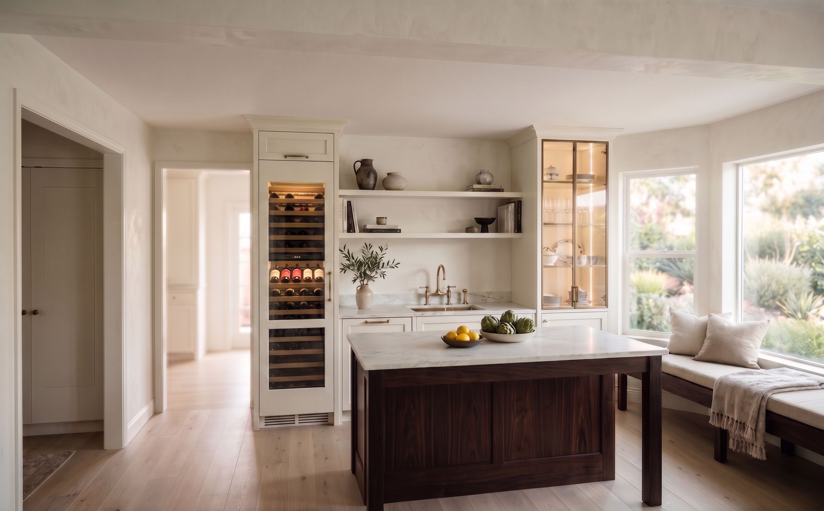 Promptmake the cabinet on the left a 24" subzero wine tower , keep exact camera angle