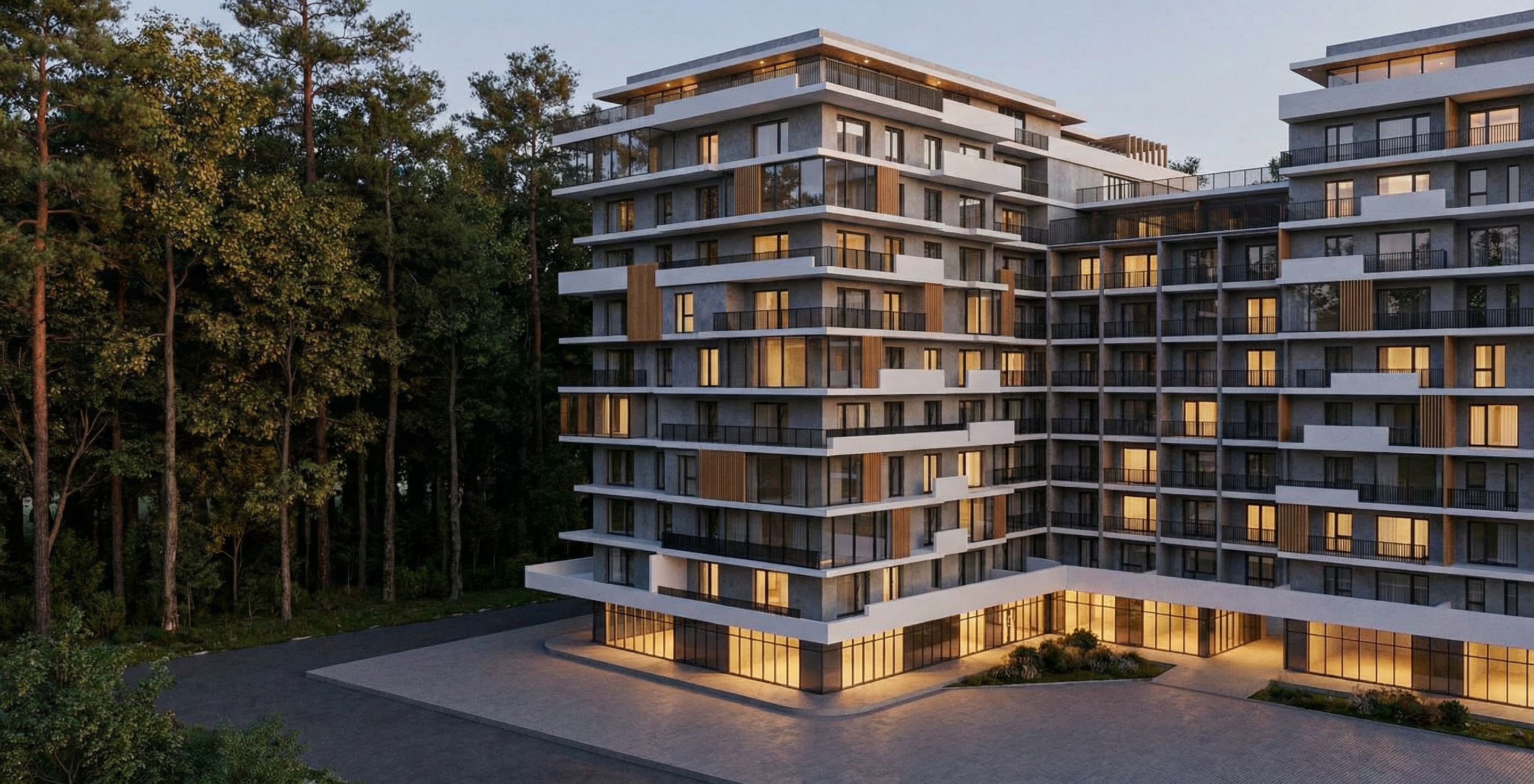 Promptarchitectural exterior rendering, render this 3D mass into photorealistic rendering, evening, near a wood, white, grey and wood, not so much.. modern design. grey walls, white on the balcony floor edge, keep exact camera angle, high quality, professional, detailed scene