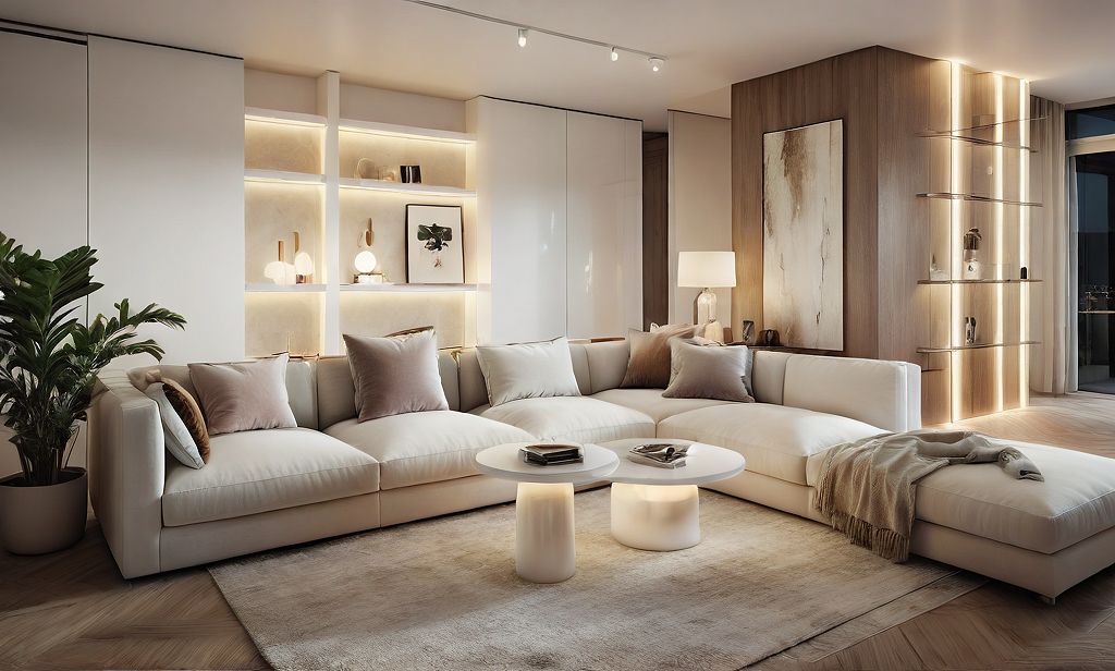 cosy luminous living room with white coffee tables