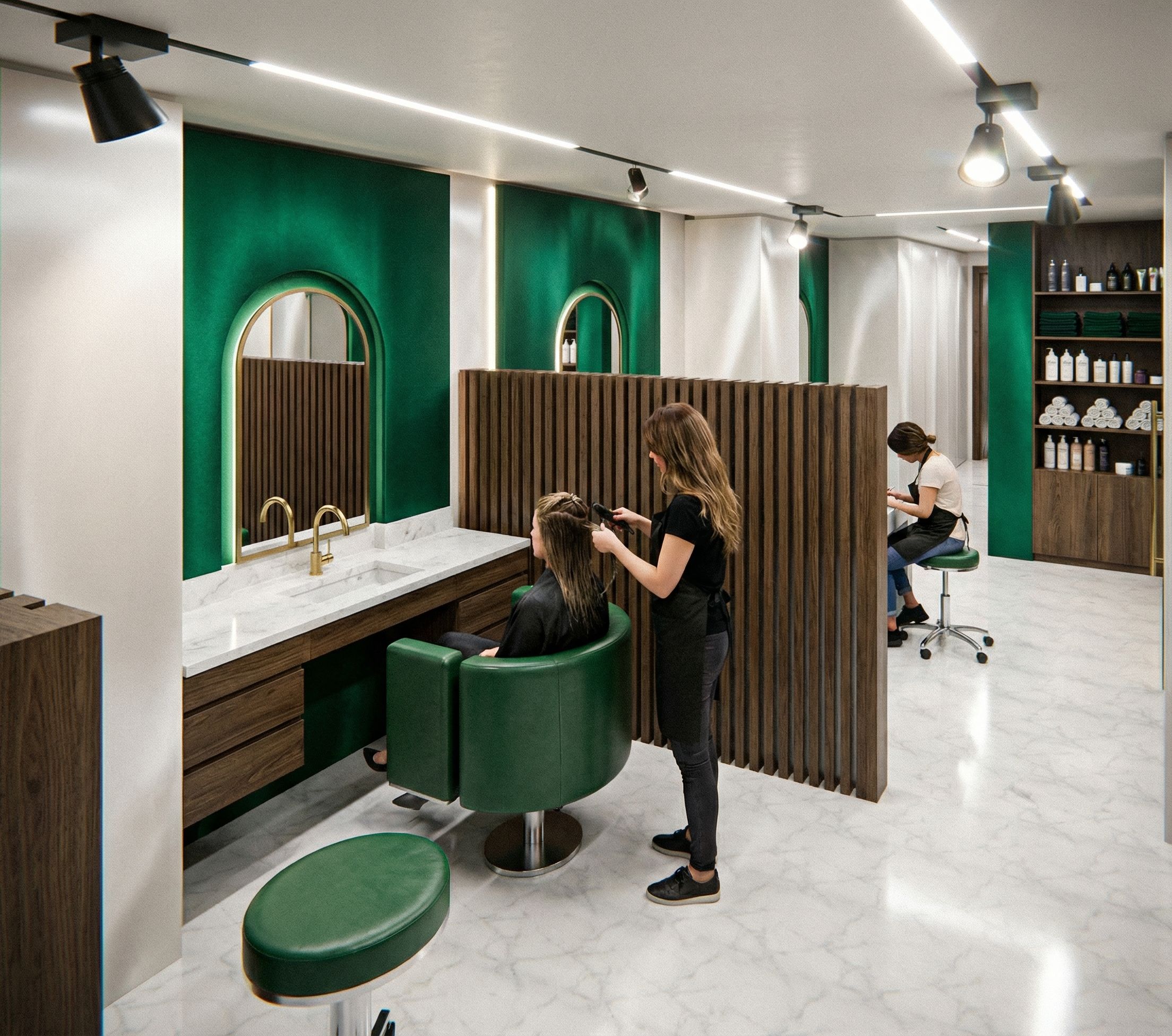 Promptthe big wall on the right should be green emerald green with satin textures. But before it there are nisches for the sitting unites with mirrors in the middle of them. Add nice curves taps. The counters and the flooring are white marmor. the drawers are dark oak just like the lamellen on the short seperation wall. on the ceiling there are spot light installed on the LED light slits. The couches are green aswell. Add bottles and towels on the cupboard behind. the wall should be too dark so between the nisches there is a level difference as a surface which is white satin wall. there is also a small puff chair with a green cushion and metall body. Its for the person who is doing the manicure and pedicure. This picture is a modeling for a womens hairdresser. , keep exact camera angle