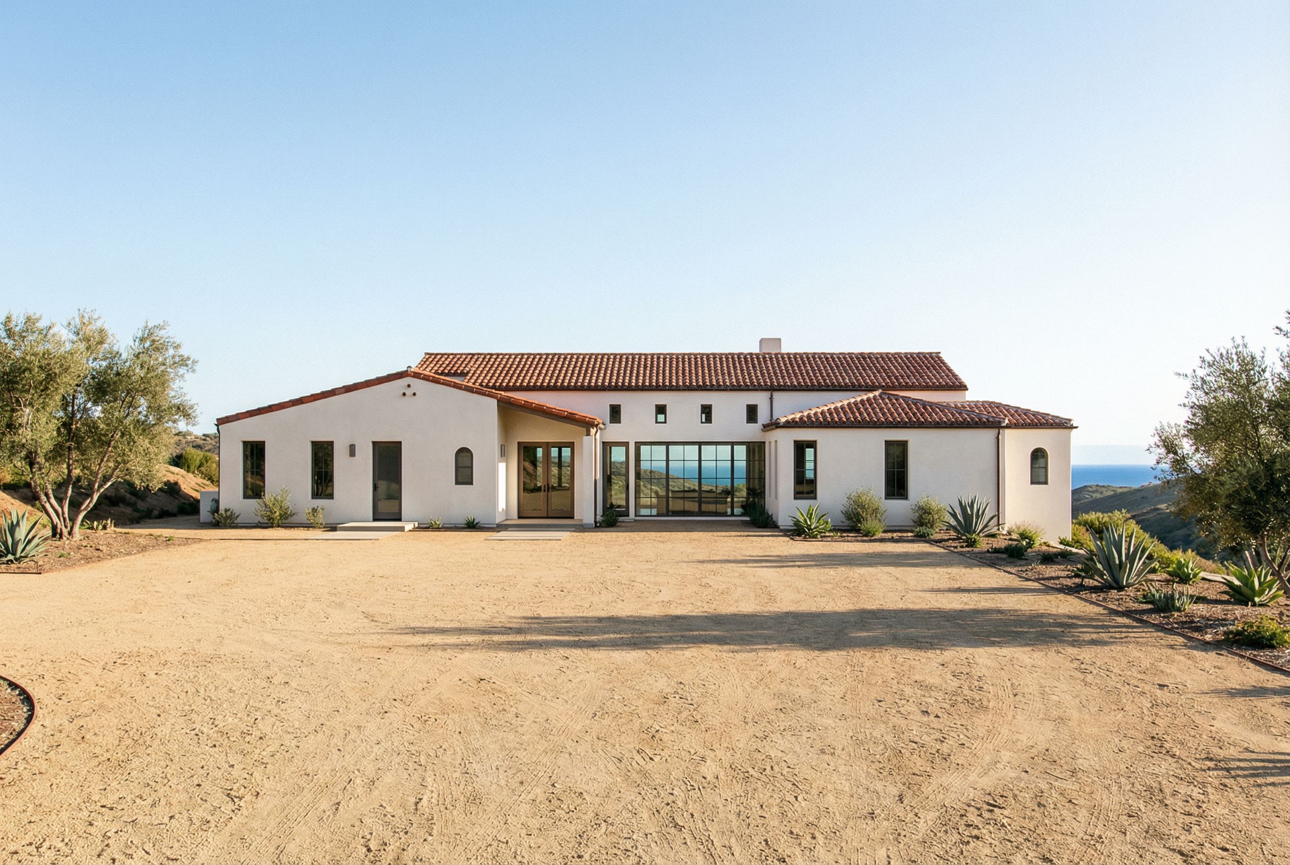 Render the exact building shown in the uploaded architectural elevation drawing. The elevation drawing defines the exact geometry and proportions of the building and must be followed precisely. There is no garage to be seen in this rendering. The right side of the reisdence is 12 feet bigger from the face of that left side of the residence. This makes the courtyard 20 feet deep. There is NO CONCRETE in the COURTYARD AREA. DO NOT CHANGE All doors and windows are set 12" deep into the exterior walls without frames around them. Doors and window frames are a gun metal bronze. There are no garages on this level. Do not show any garages or garage doors or pathways to a garage. The courtyard is all decomposed granite. There is no concrete surface except at the single service door between the glass windows on the left and the double main entry doors to the right of it where both have one concrete step up. Do not redesign or reinterpret the architecture. Do not change any geometry or location of doors and windows. Do not add any doors or windows. You can see through the building from the courtyard to the other side that would revel rolling hills leading down to an ocean of blue water in the distance. On either side of the resiudence, the terrain and landscape slopes away from the building. Match the elevation drawing exactly: - same roof shapes and roof heights - same number and spacing of windows - same door locations - same wall lengths - same central glass window wall - same narrow vertical clerestory windows above - same stucco wall surfaces - same clay tile roof This is a Mediterranean hillside residence with smooth white stucco walls, red clay barrel tile roof, and black steel framed windows and doors. The courtyard surface in front of the building is decomposed crushed granite exactly as shown in the drawing. Landscape is minimal drought tolerant Malibu landscaping with olive trees and agave. Lighting is warm daylight. Photorealistic architectural rendering with extremely accurate building geometry based on the architectural drawing. strictly follow the elevation drawing geometry do not add or remove windows do not change the building layout do not change the roof shapes Negative Prompts - modern glass box extra windows missing windows different roof balconies cars people urban street