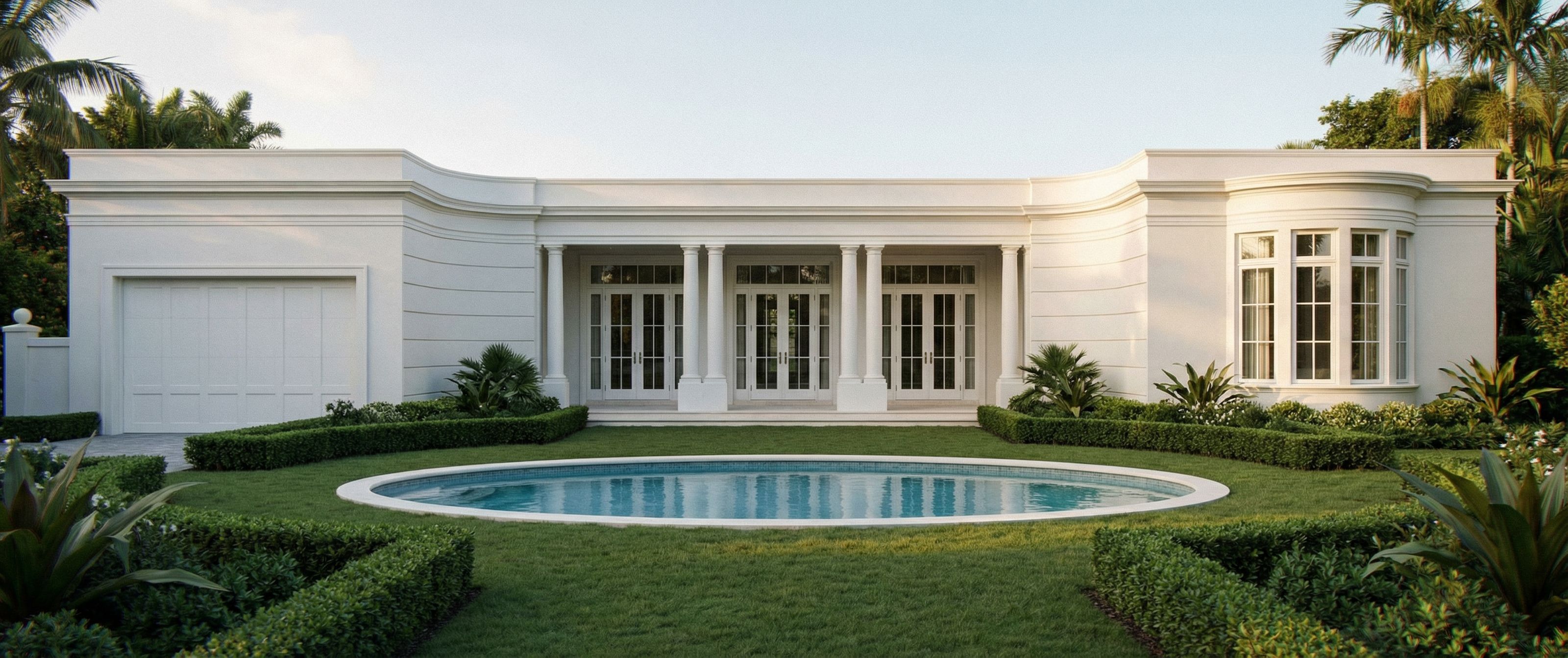 Ultra-photorealistic perspective elevation rendering of a Neo-Classical Regency Palm Beach rear façade using the provided line drawing as a fixed architectural blueprint. The drawing defines the exact proportions, heights, widths, alignments, spacing, and massing relationships and must be followed precisely. Do not redesign, reinterpret, stretch, compress, or rebalance the composition. Preserve all architectural elements exactly as drawn. The façade is composed of three primary parts with a strict depth hierarchy: the central loggia is the furthest back element, the doors within the loggia are recessed even further behind the columns, and the two flanking wings, the garage wing and bedroom wing, sit forward of the loggia and align with each other. These offsets must remain clearly visible in perspective and must not be flattened or exaggerated. The wall sections adjacent to the loggia with the horizontal lined detailing are true curved concave transition walls, not flat walls, and they must read clearly as curved surfaces creating a soft transition between the wings and the recessed center loggia. The bedroom wing contains a true semi-circular projecting bay window that must read clearly as a bay window, not a flat wall. The bay must project outward from the main wall plane with visible depth, continuous smooth curvature, and a clear shadow break where it meets the wall. Its proportions must be historically appropriate to Regency architecture: elegant, restrained, secondary to the central loggia, moderately projecting, and slightly lower and more horizontally proportioned so it sits comfortably below the entablature rather than pressing into it. The bay should feel integrated with the wing and proportionate to the overall composition, not oversized, bulky, or tower-like. The architecture should have refined Regency character with disciplined symmetry, crisp classical lines, shallow relief, and elegant restraint, with no heavy ornament and nothing overly ornate. All exterior walls are smooth white stucco with a clean refined finish, not limewashed and not heavily textured. Trim is also white with subtle tonal variation only through light and shadow. Keep the detailing crisp and classical. The rear garden includes an oval pool centered on the loggia axis, with its long side running parallel to the façade and visible in the foreground. The pool must remain modest in scale and secondary to the architecture, used mainly for placement and composition, never oversized or overpowering. Landscape the setting as a refined Palm Beach rear garden with symmetrical organization, clipped hedges, soft lawn, and restrained tropical planting that supports the architecture without distracting from it. Use soft warm afternoon light with gentle shadows that reveal the recessed loggia, curved transition walls, and the projection of the bay window. Render as a perspective elevation, not a dramatic perspective and not a flat orthographic elevation: a lightly angled, controlled architectural view with minimal distortion, slightly elevated or eye-level, using a lens that preserves the drawing’s proportions while still showing the depth relationships clearly. The overall image should feel elegant, calm, highly realistic, and architecturally precise. Do not flatten the façade, do not alter proportions, do not modernize, do not add ornament, do not make the pool too large, do not turn the curved walls into straight planes, and do not make the bay window too tall, too deep, too wide, or too visually dominant., keep exact camera angle