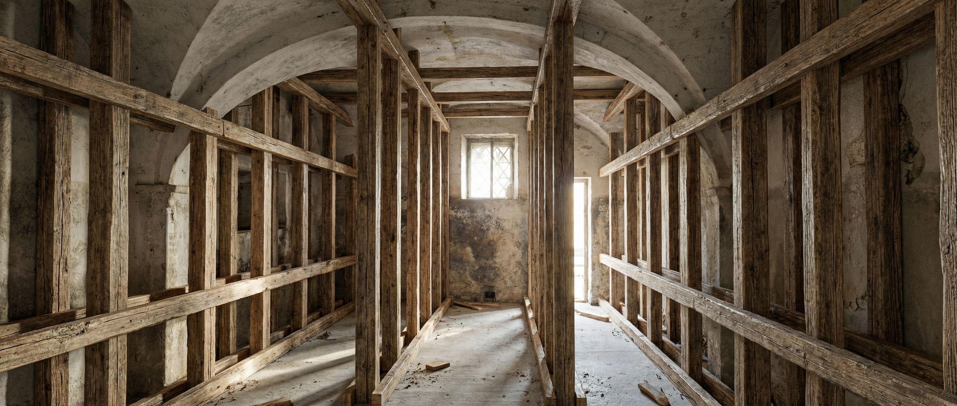 Promptarchitectural exterior rendering, render this 3D mass into photorealistic rendering, INSERT WOODEN PROPS IN A 1M GRID PATTERN, THROUGHOUT THE FLOOR UP TO THE CEILING, keep exact camera angle, high quality, professional, detailed scene