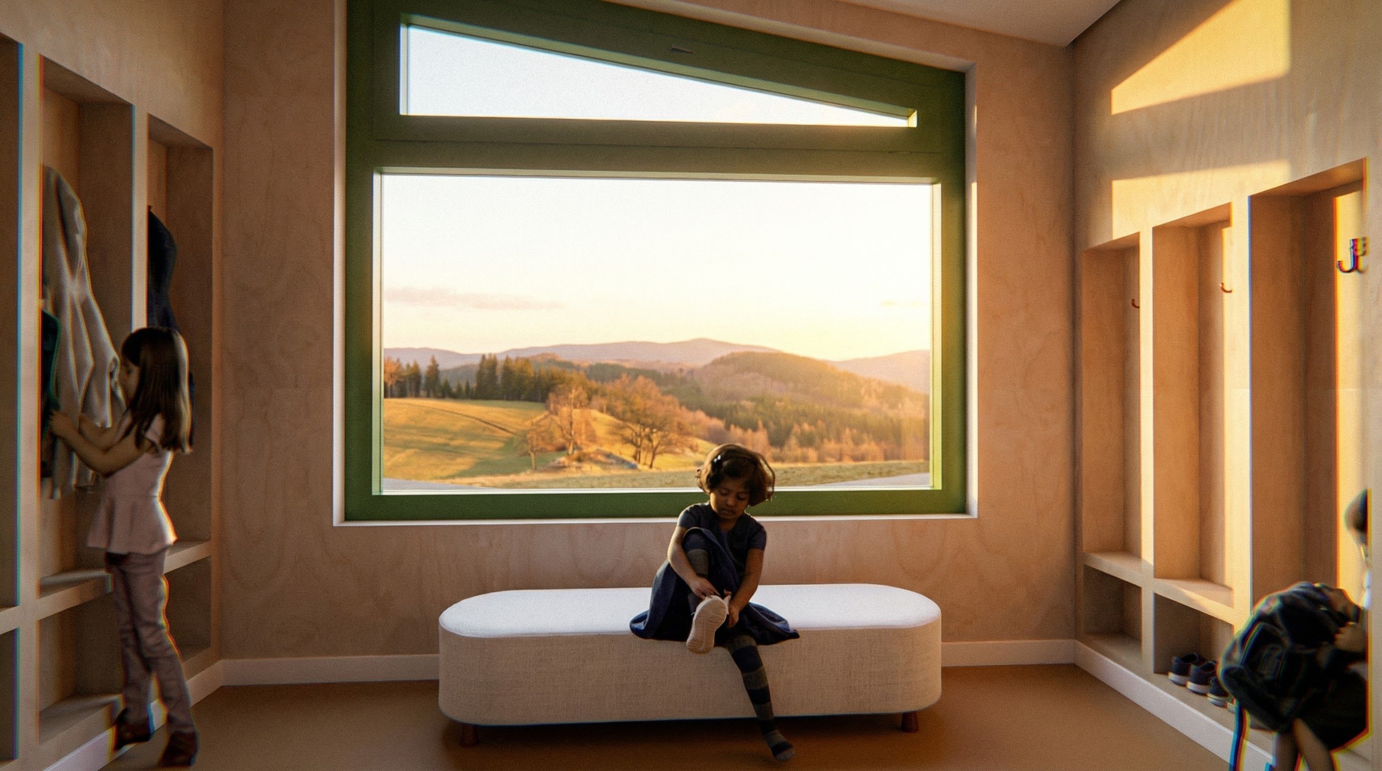PromptEingangsbereich. Bitte Birkenholz etwas zurückgenommen und nicht so aufdringlich. Mädchen hängt Jacke auf. Kind stellt Schuhe unten rein. Boden Linoleum in braun gleichmäßig und weiße fußleisten. Fuß von Kind soll nicht so abgeschnitten aussehen, keep exact camera angle