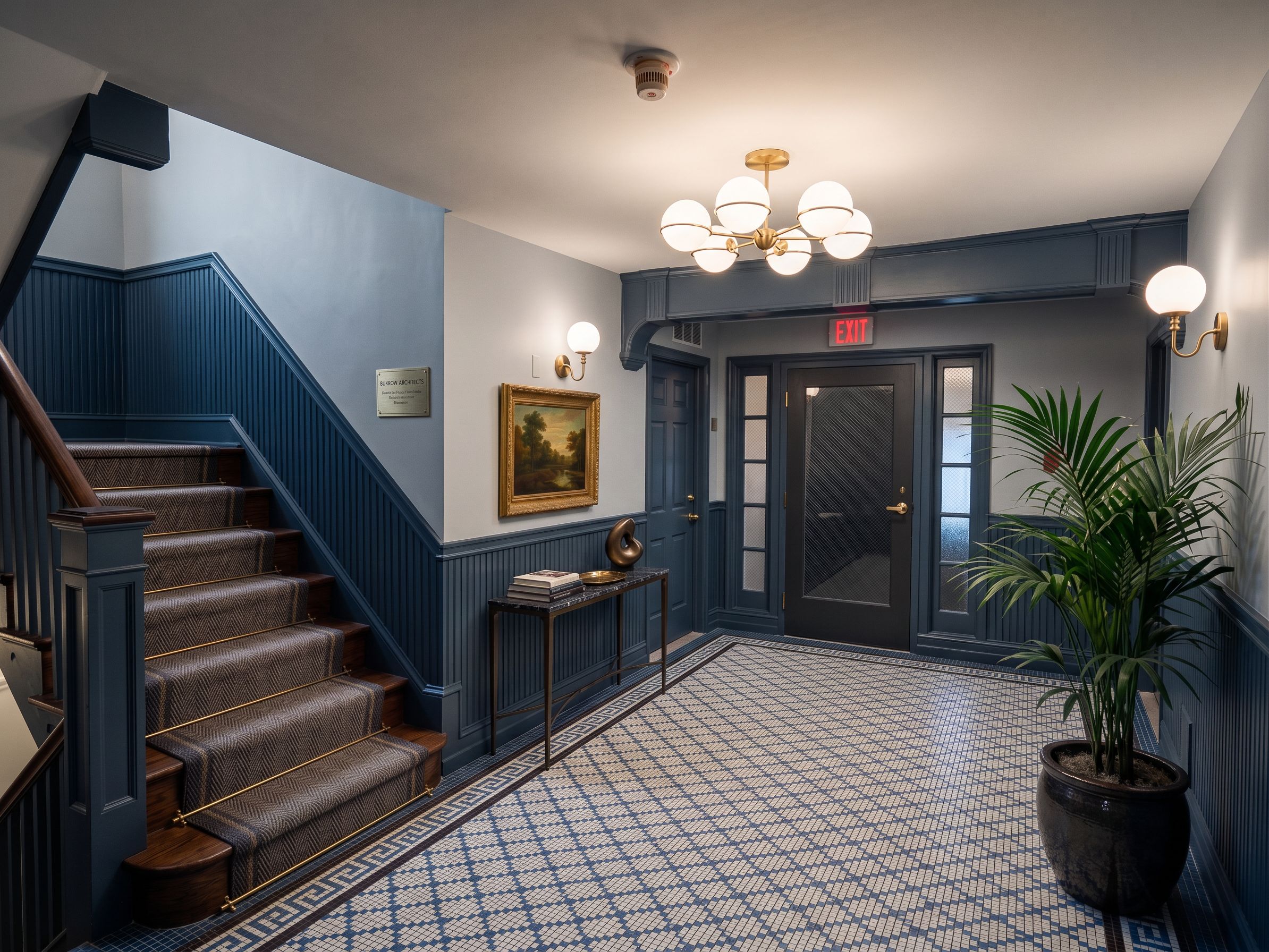 Refresh this tired lobby using the reference image. Wall mouldings, paint color, light fixtures, flooring and accents should all be used. , keep exact camera angle